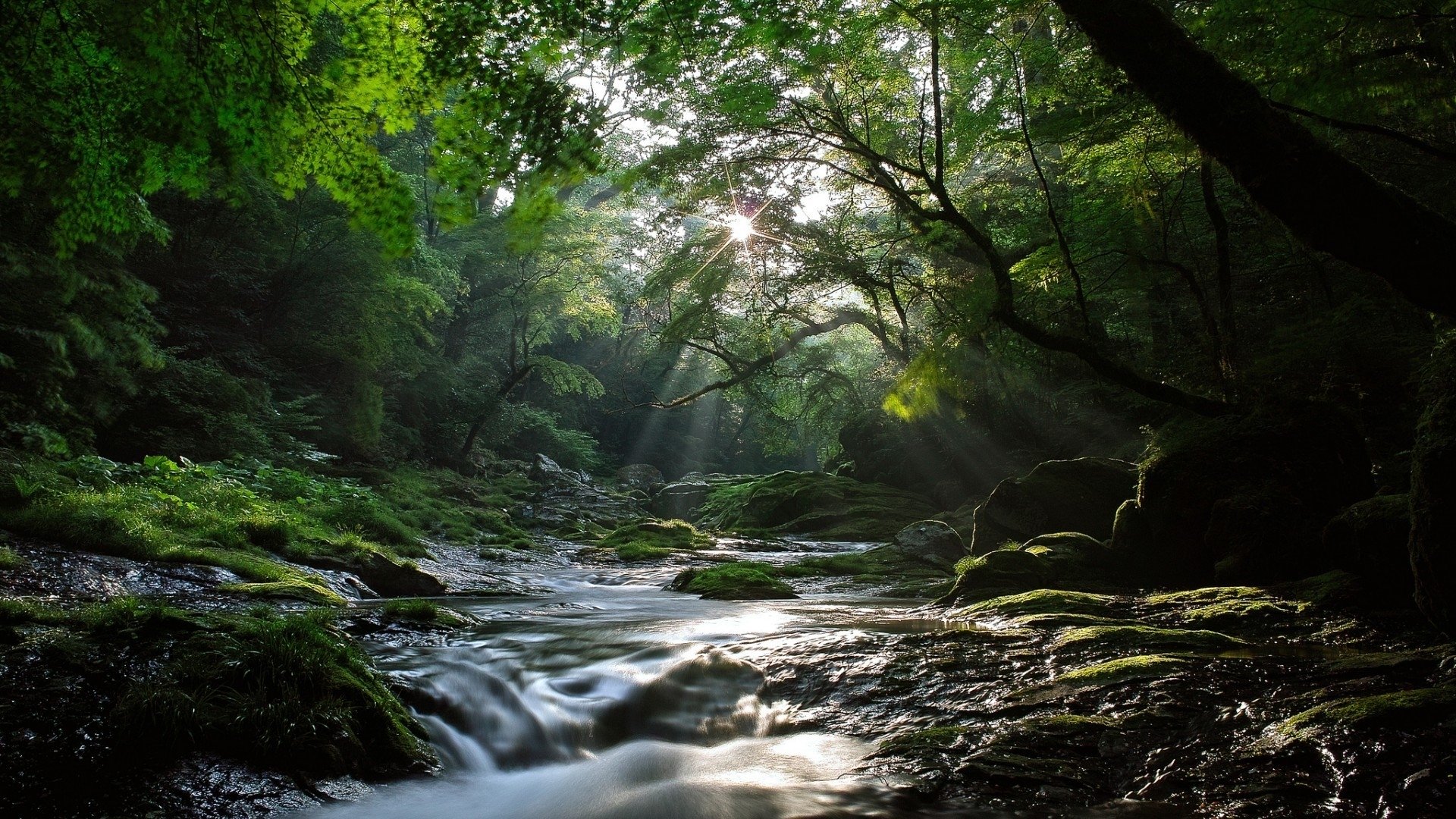 Description: A stream running through a lush green forest filled with trees and rocks.