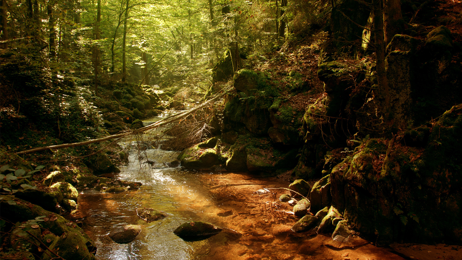 Description: A stream running through a lush green forest filled with trees and rocks.