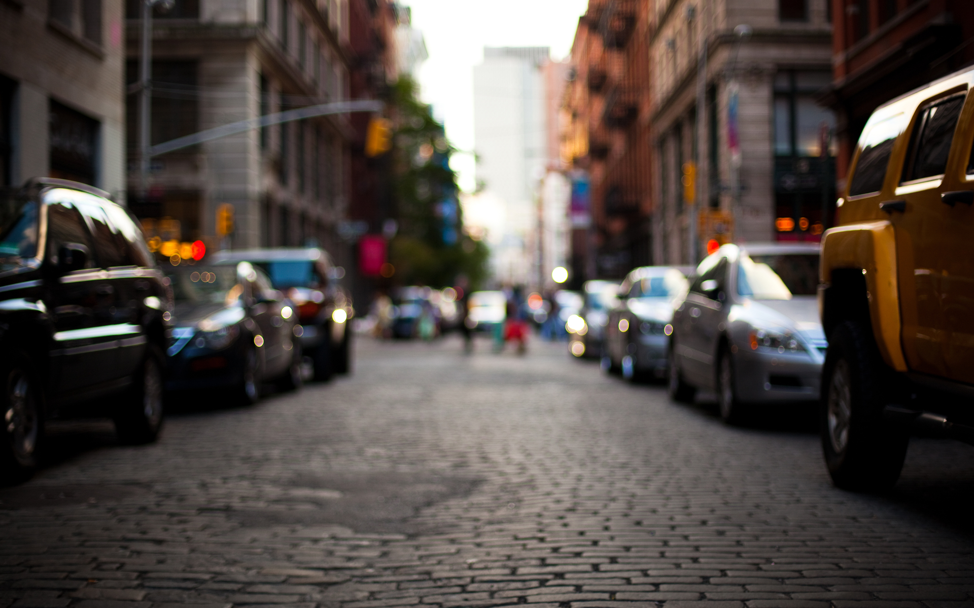Description: A street with cars parked on both sides of it and a yellow truck parked on the side of the street.