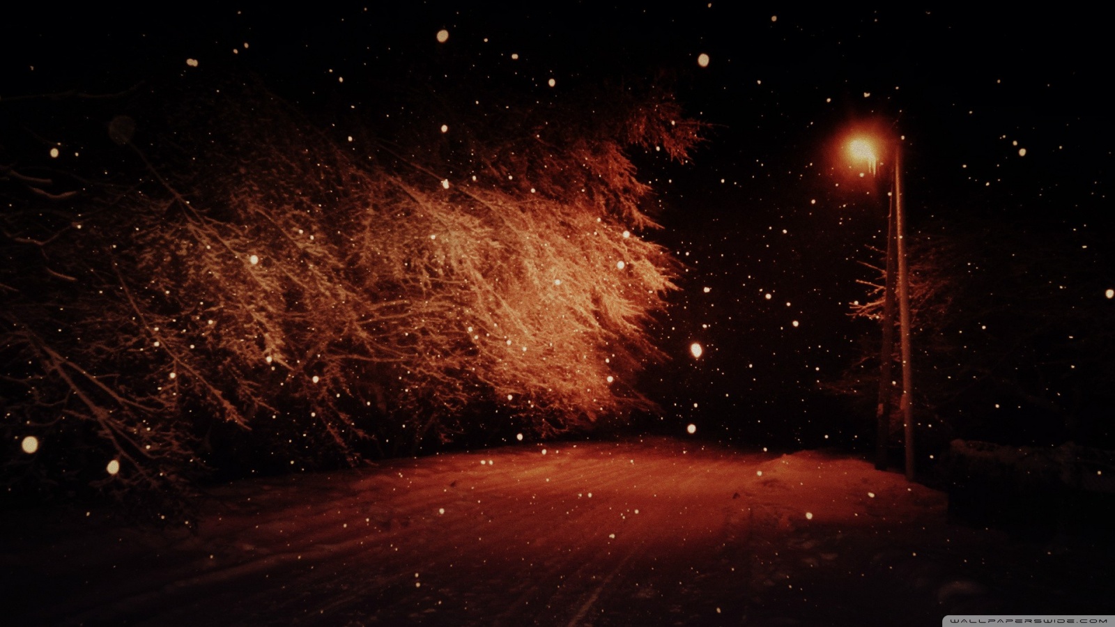 Description: A street light on a snowy night with snow flakes on the ground and trees in the background and a street light in the foreground.