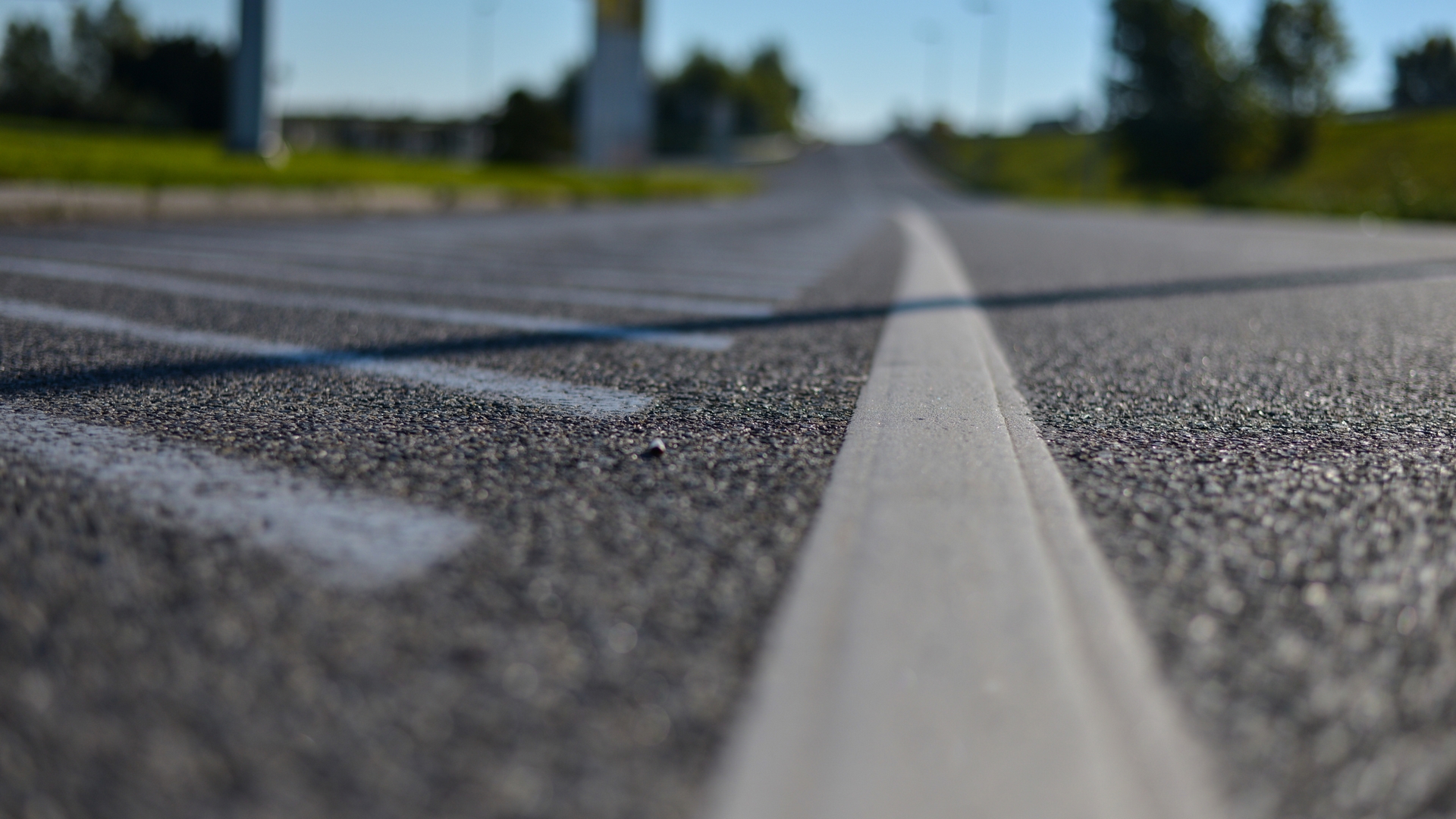 Description: A street with a white line painted on it and trees in the background and a blue sky in the background.