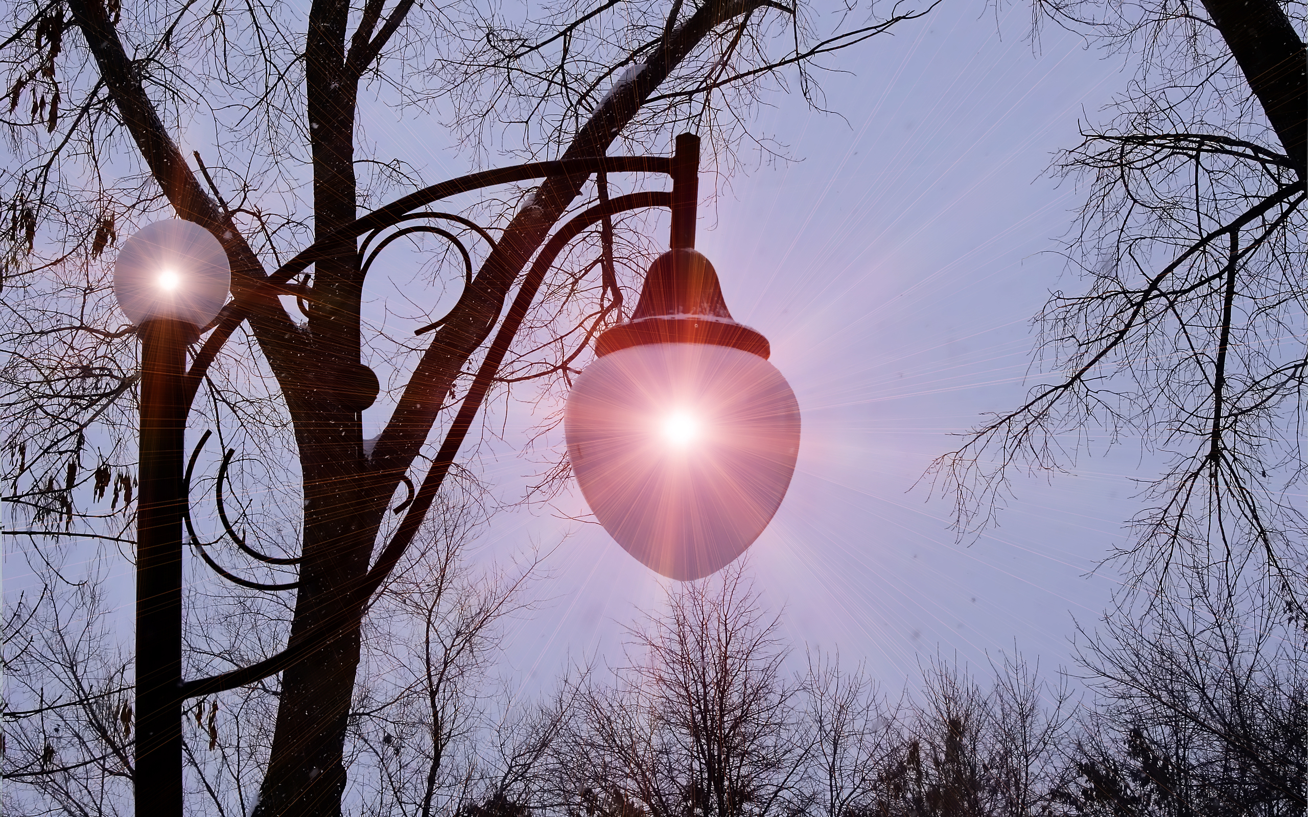 Description: A street light hanging from a tree with the sun shining through the branches behind it and a blue sky.