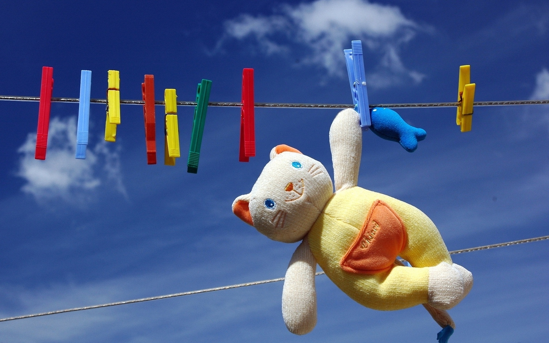 Description: A stuffed animal hanging on a clothes line with clothes pins in the background and a blue sky with clouds.