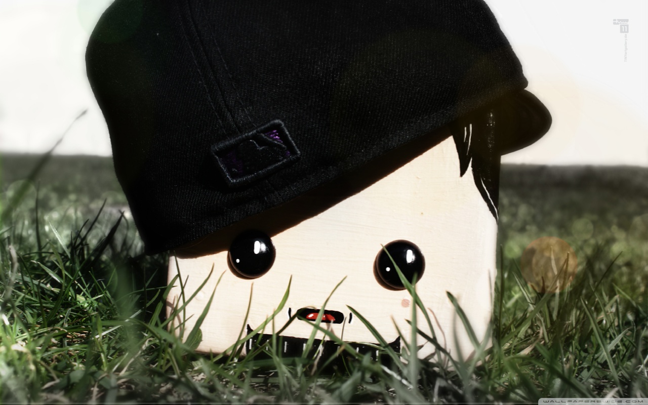 Description: A stuffed animal wearing a hat laying in the grass with eyes wide open and a nose missing.