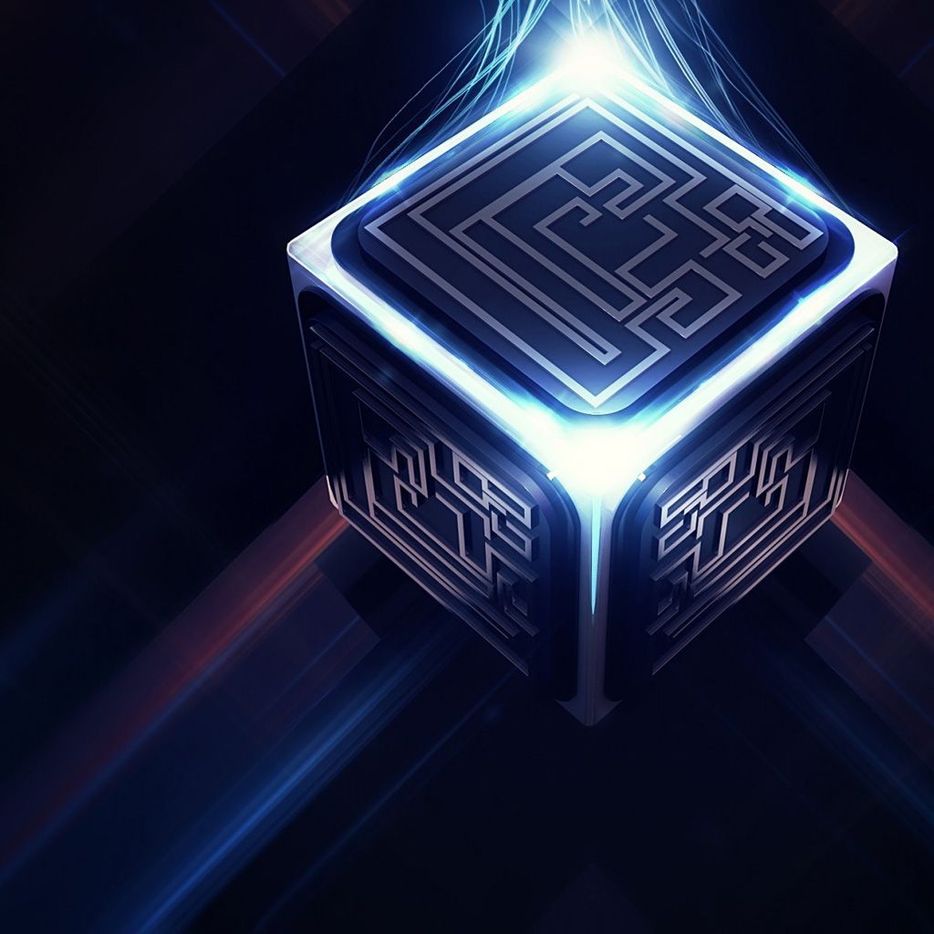 Description: A stylized cube with a glowing light coming out of it's center and a blue flame coming out of it.