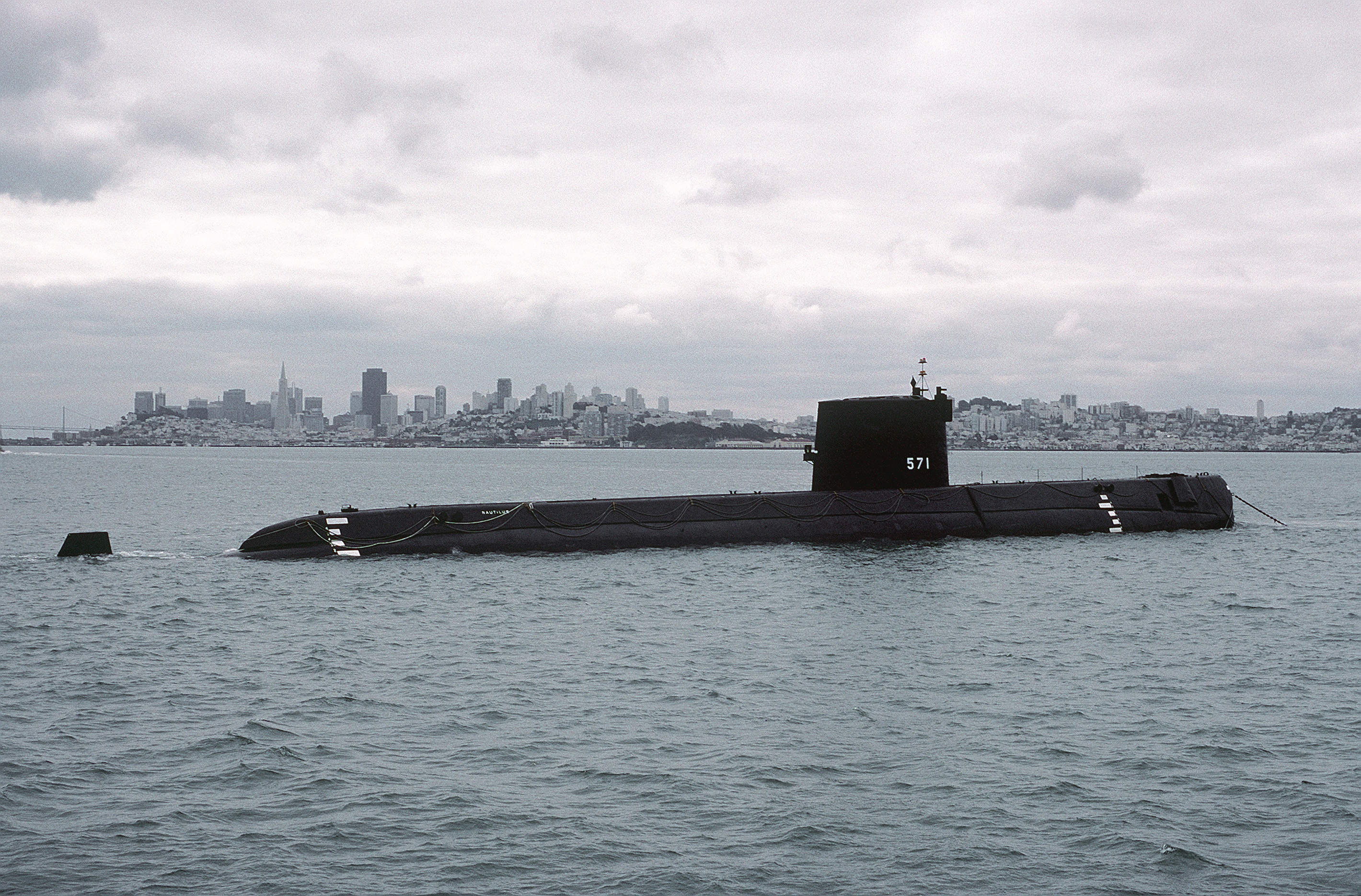 Description: A submarine floating in the water near a city skyline in the distance with a tug boat in the foreground.