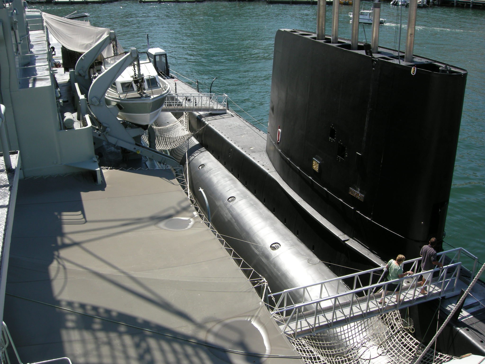 Description: A submarine is docked at a dock in the water with a man standing on the deck of it looking at the camera.