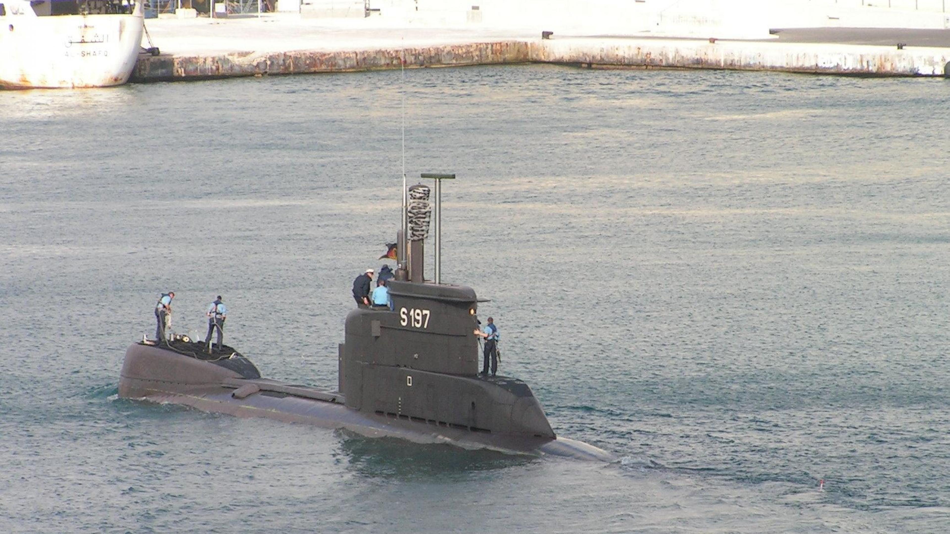 Description: A submarine is in the water with two men on it's side and another man standing on the boat.