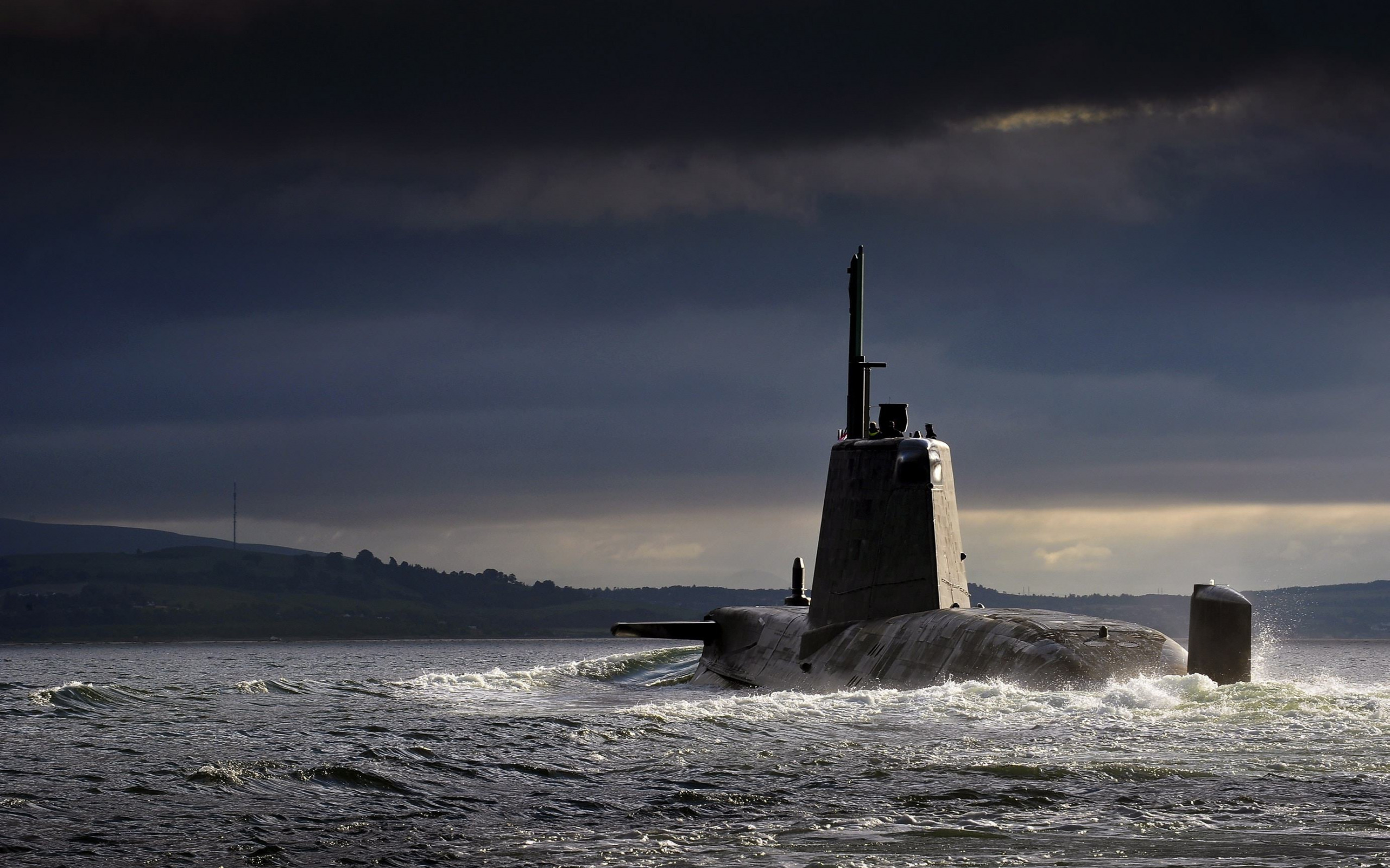 Description: A submarine is in the water with a dark sky in the background and a mountain in the distance with a dark cloud.