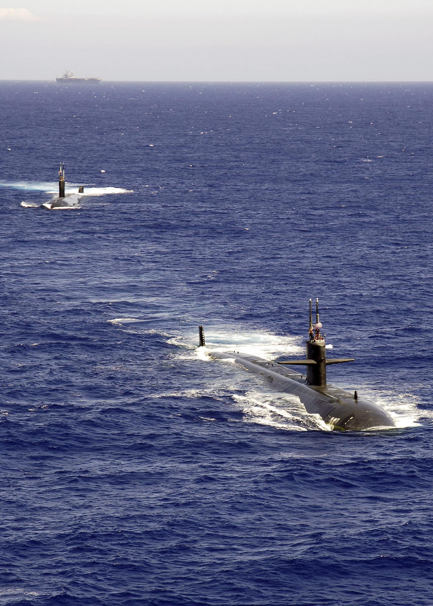 Description: A submarine in the middle of the ocean with a ship in the background in the distance.