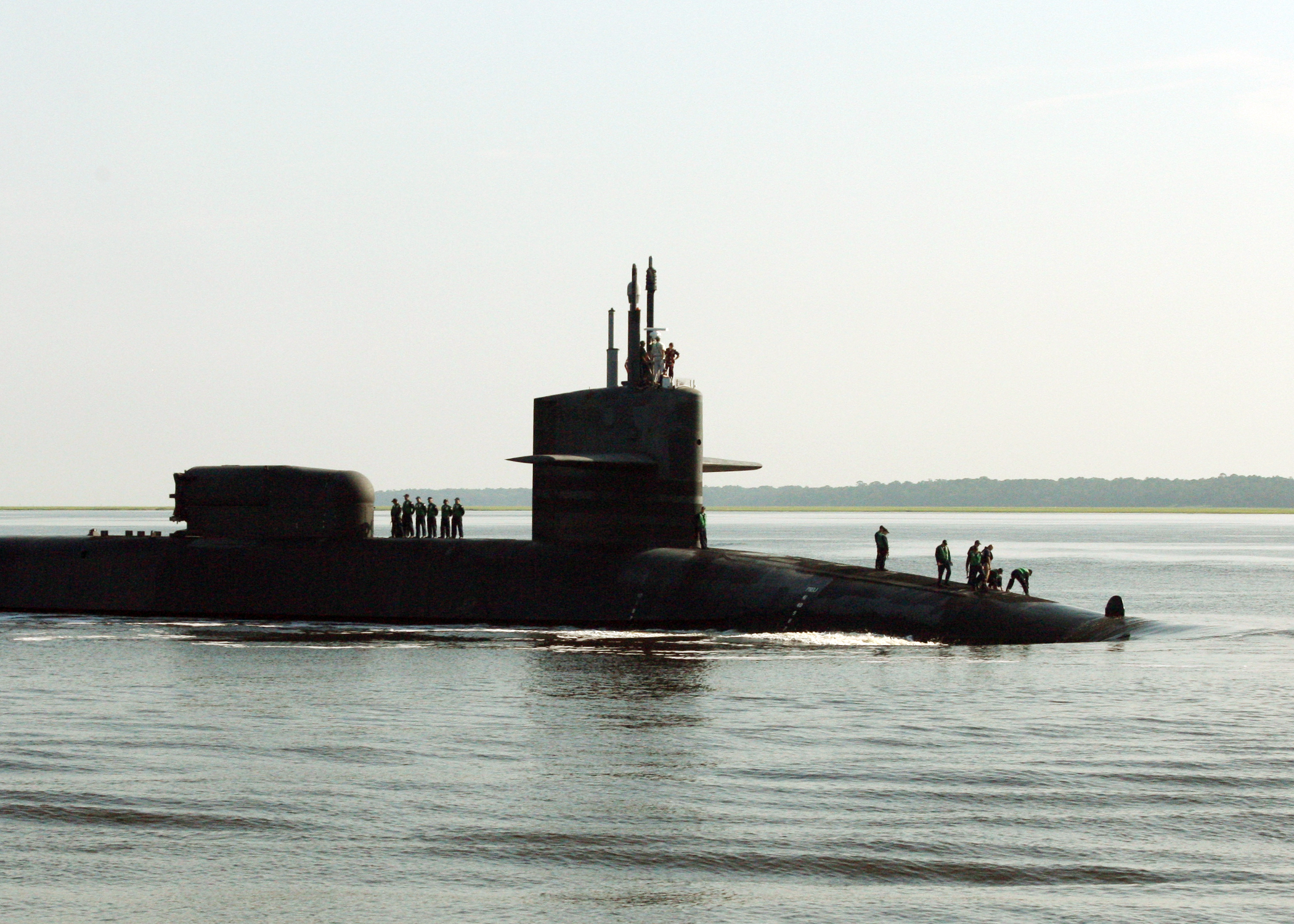 Description: A submarine is in the water with people standing on it's side and in the water.