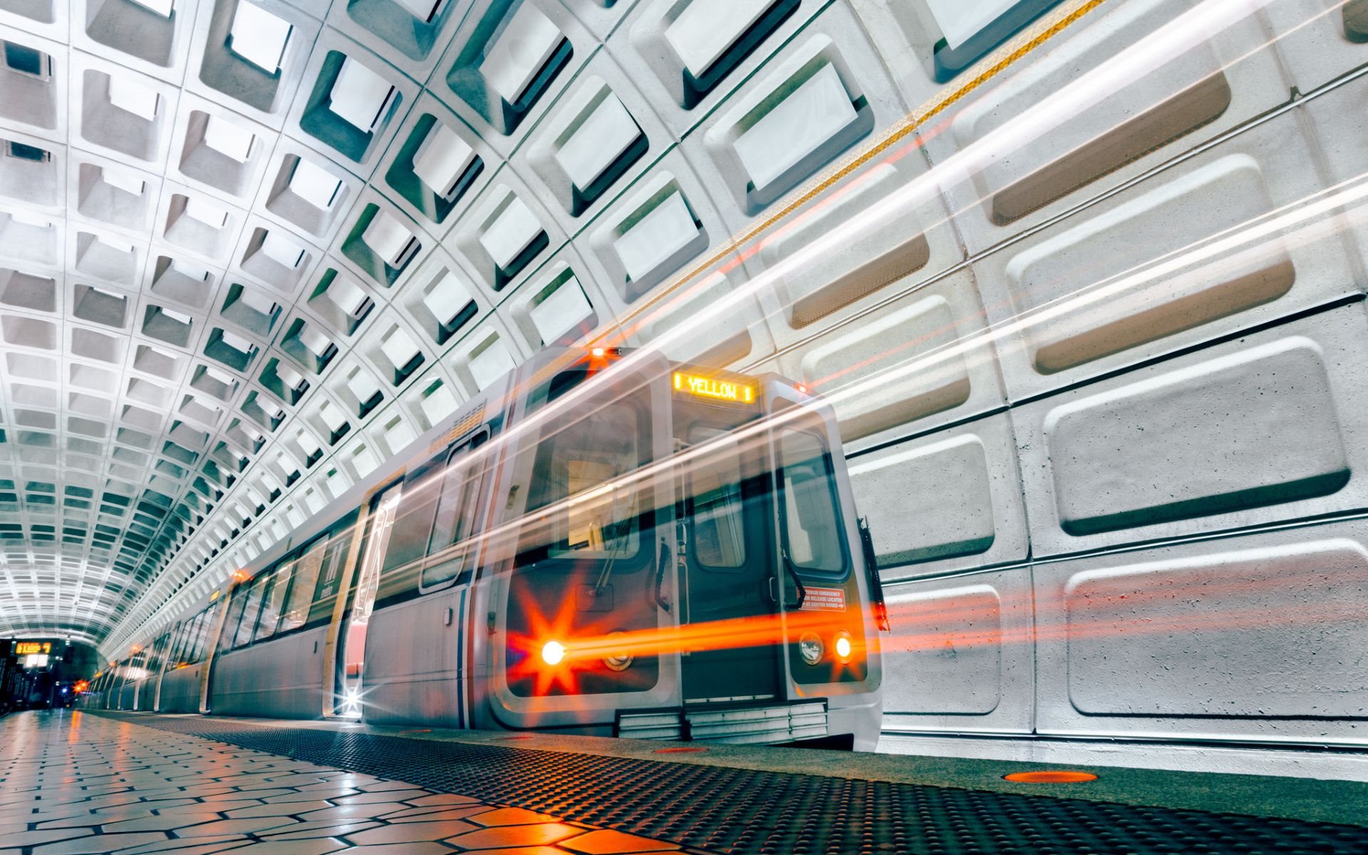 Description: A subway train is moving through a subway station with a lot of windows on the ceiling and a tiled floor.