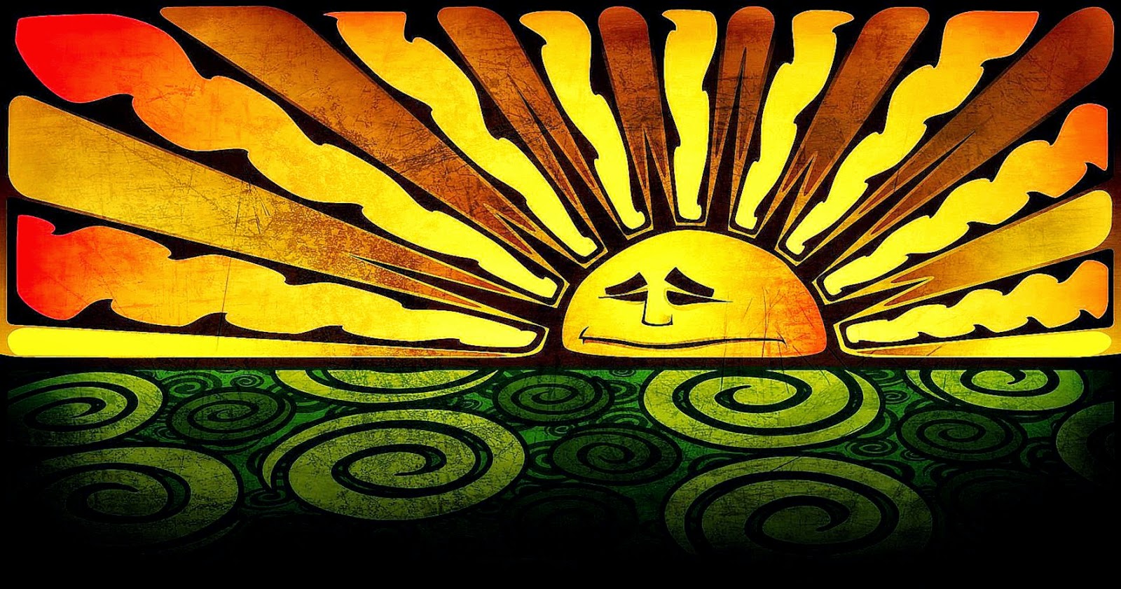 Description: A painting of a sun with a face on it's face and a green and yellow background with swirls.