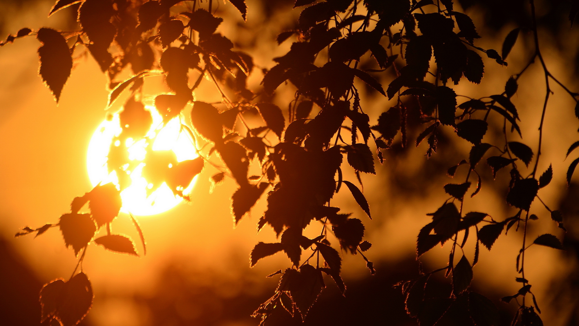 Description: The sun is shining through the leaves of a tree in the evening time.