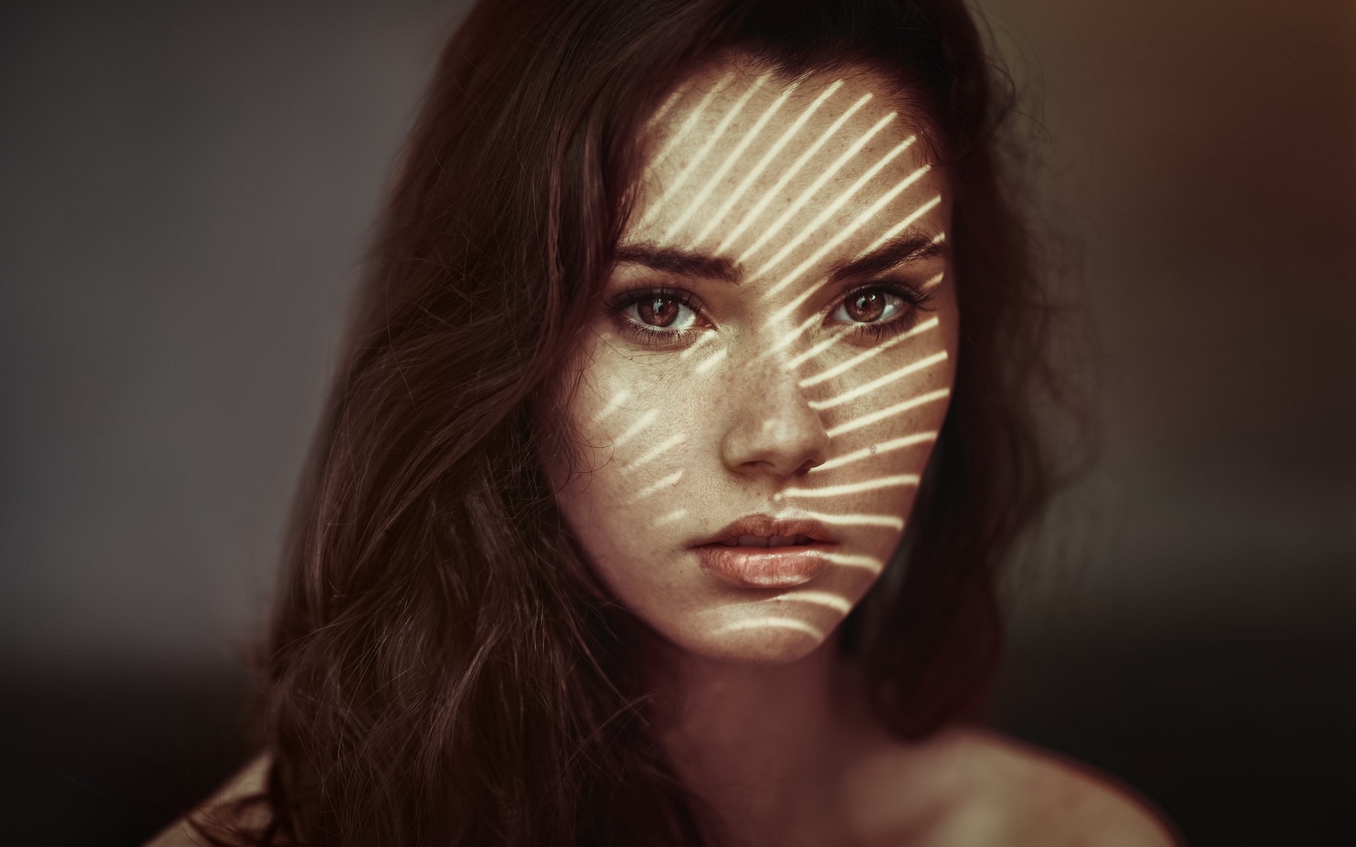 Description: A woman with a sun pattern on her face and a shadow on her face behind her head.