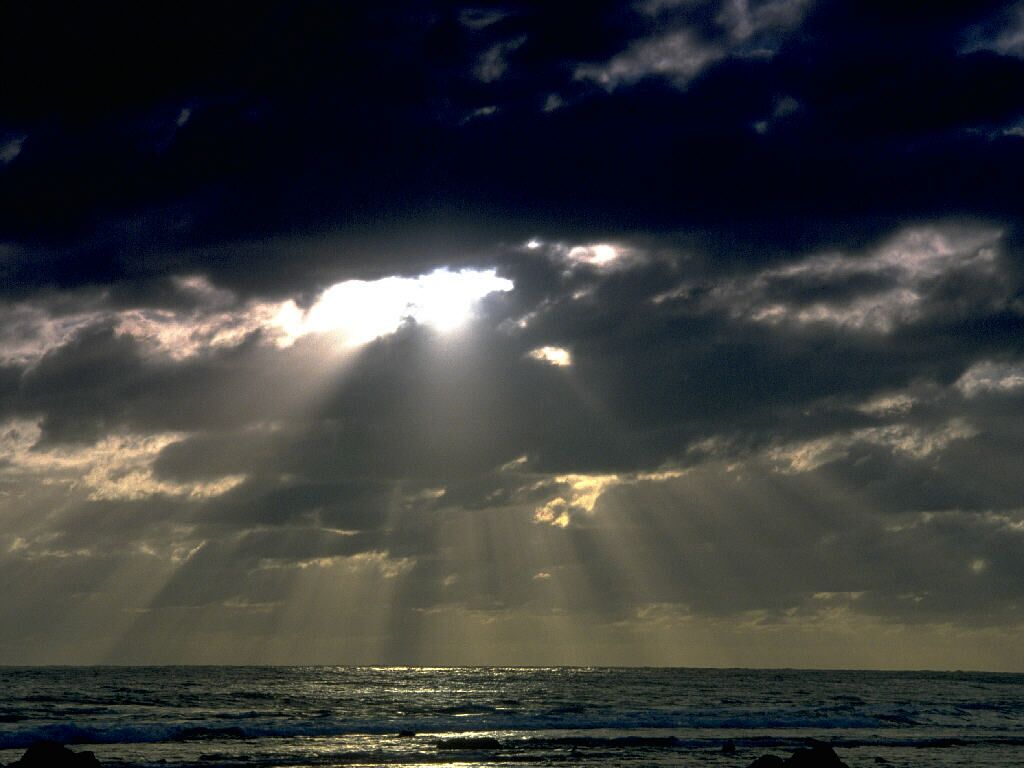Description: A sunbeam shines through the clouds over the ocean on a cloudy day at the beach with a surfboard in the foreground.