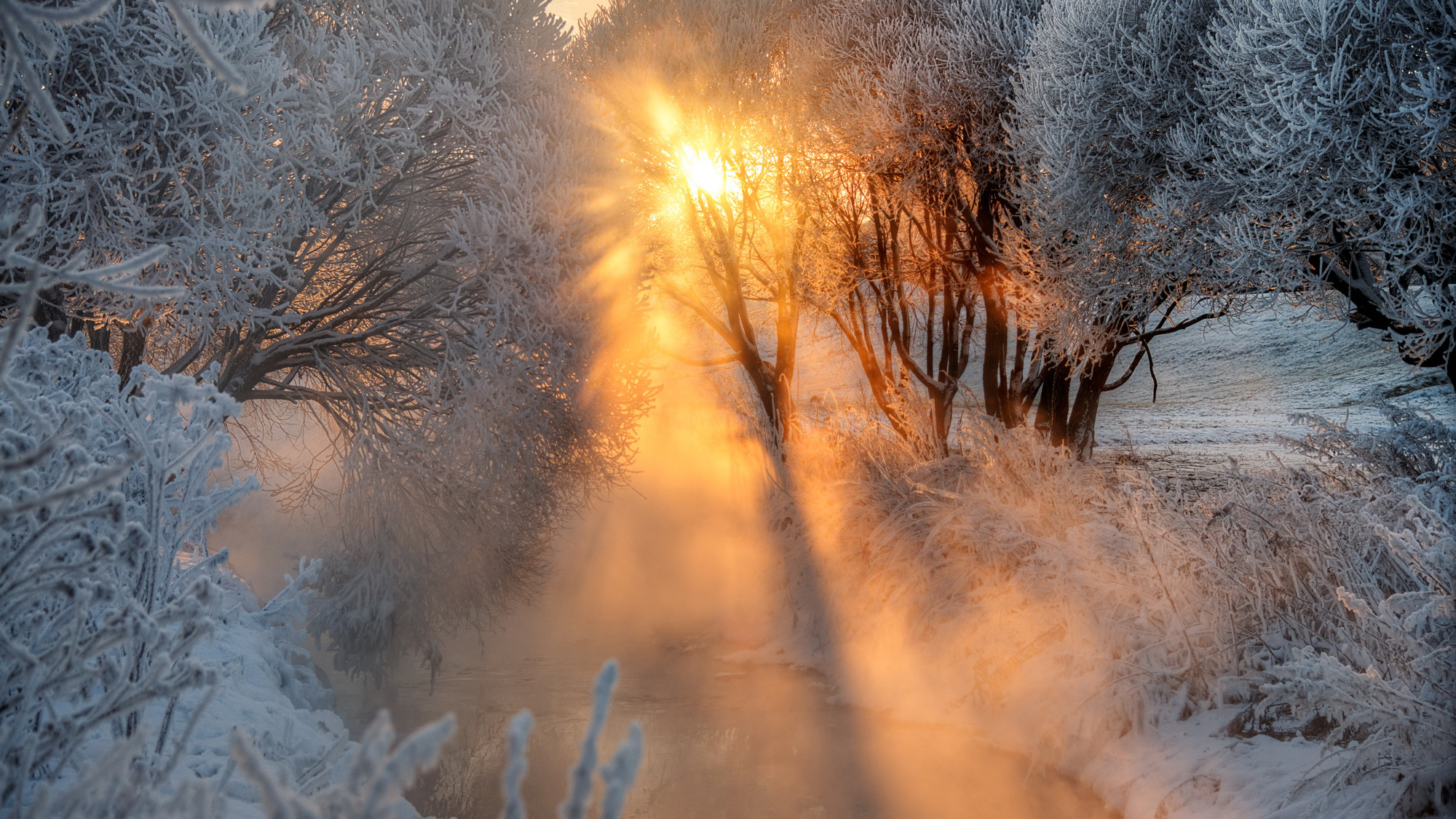 Sunbeam forest snow stream volumetric - free wallpaper for desktop | 5desktop.com