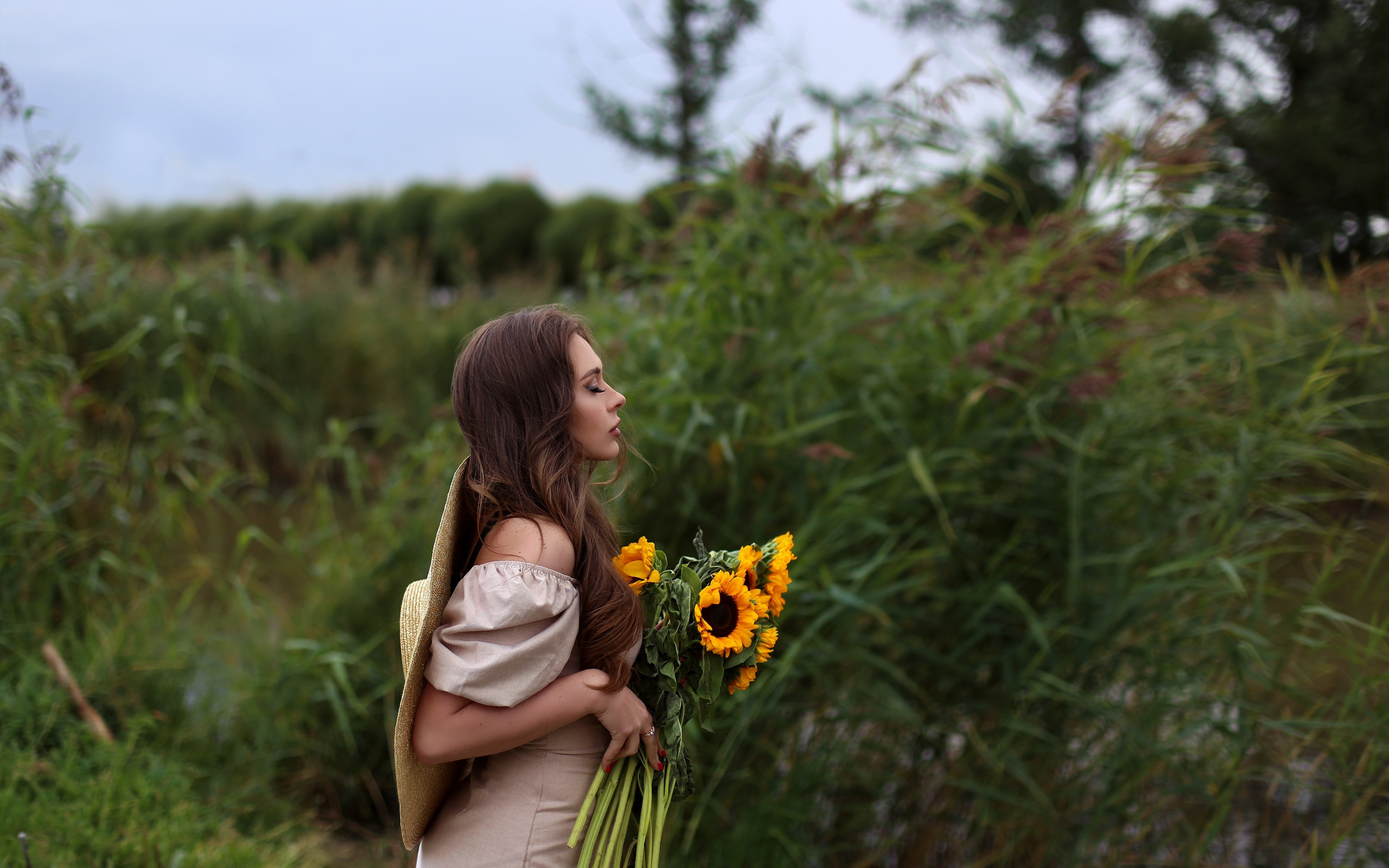 Description: A woman holding a bouquet of sunflowers in her hands and looking away from the camera.