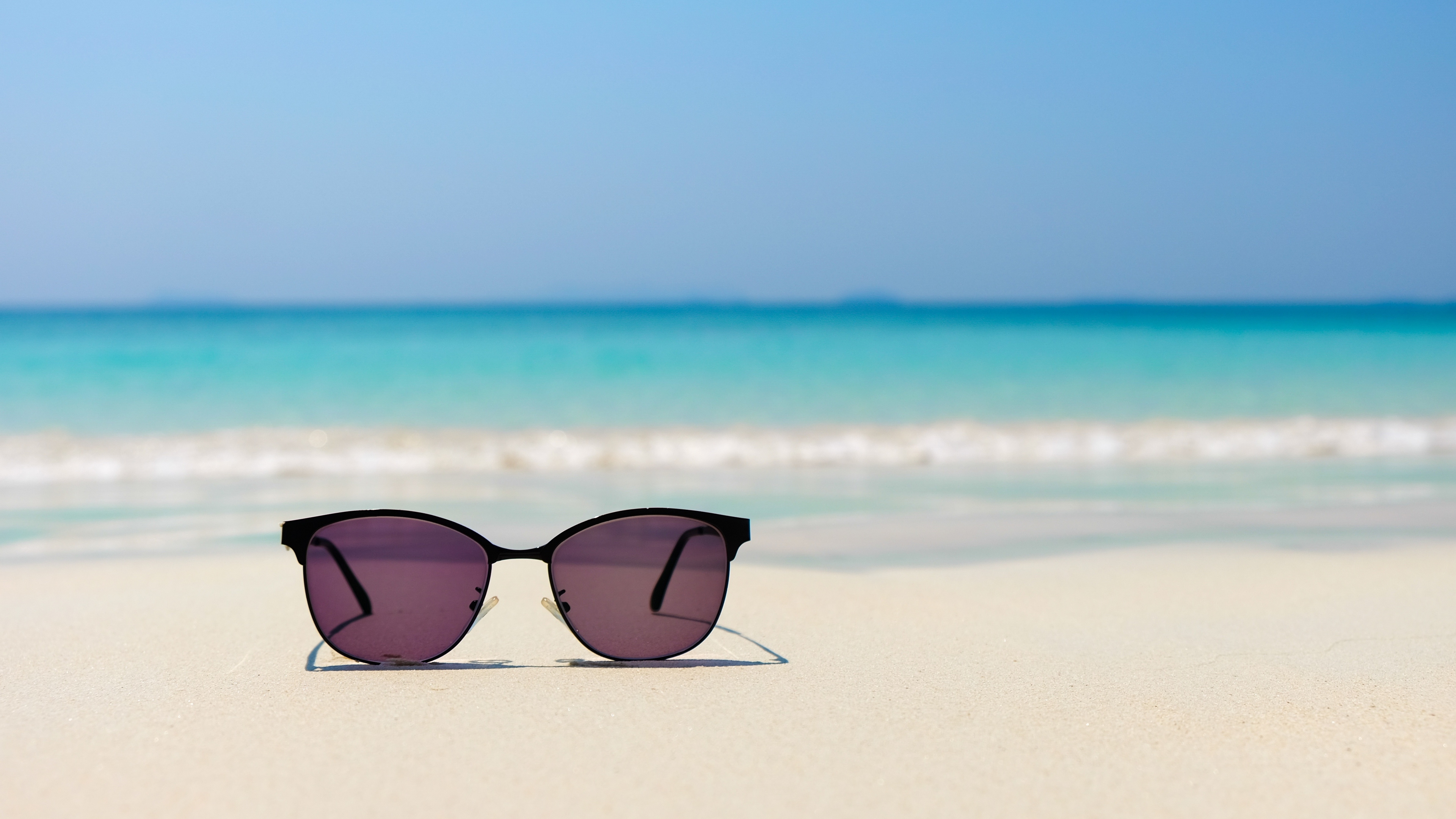 Description: A pair of sunglasses sitting on top of a sandy beach next to the ocean on a sunny day with blue skies.