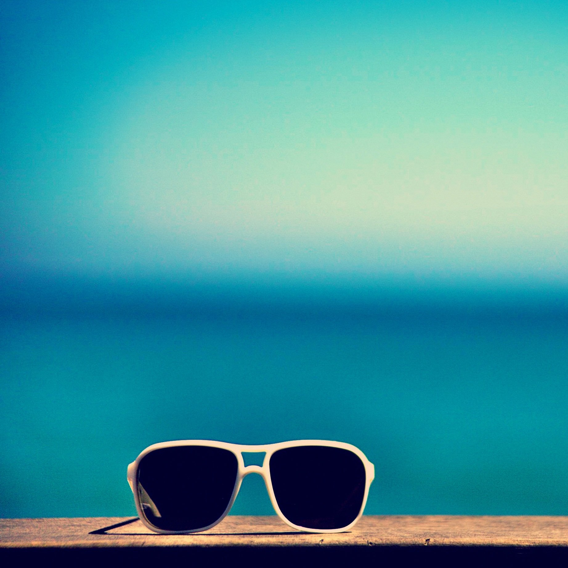 Description: A pair of sunglasses sitting on a ledge near the ocean with a blue sky in the background and a blue sky in the foreground.