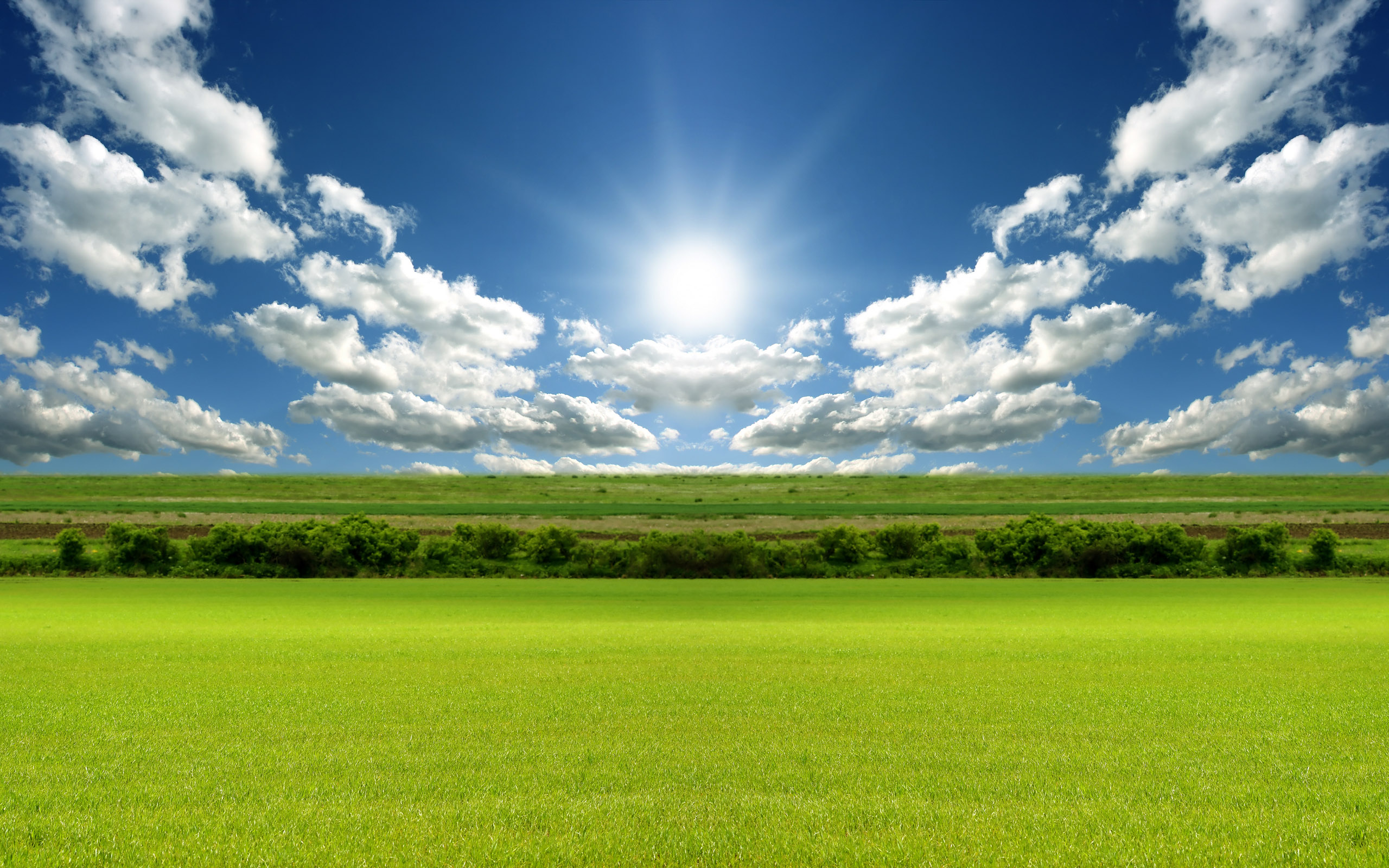 Description: A field with a bright sun in the sky above it and a field of grass below it with trees and bushes.