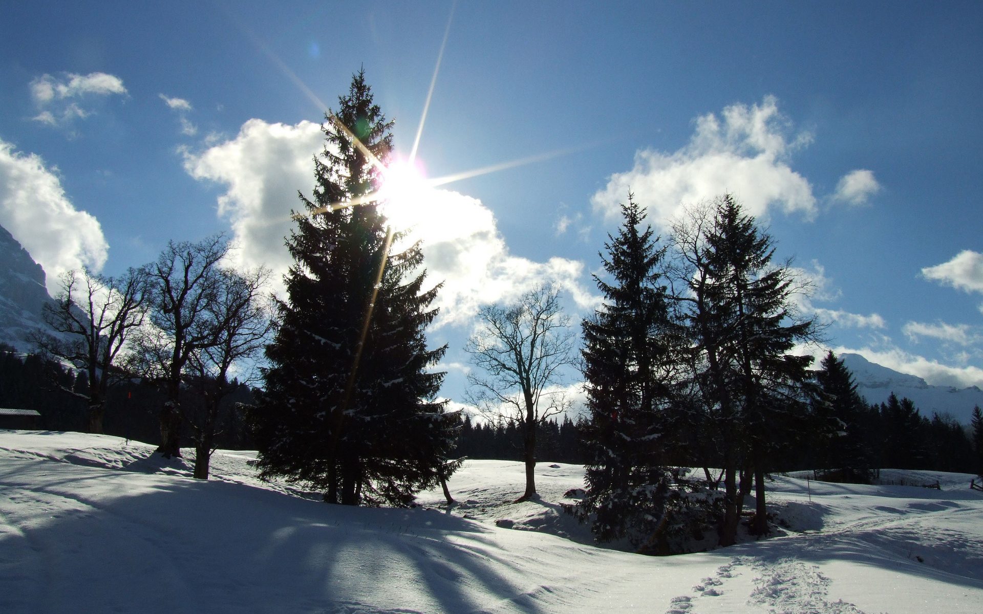 Description: A sunny day with a snow covered field and trees in the foreground and a bright sun in the background.