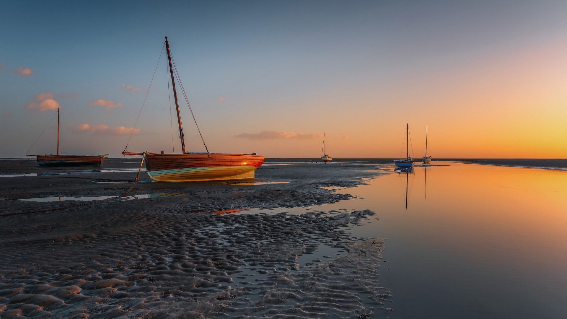 Description: A beach with boats on it and a sunset in the background with clouds in the sky and water reflecting off the sand.