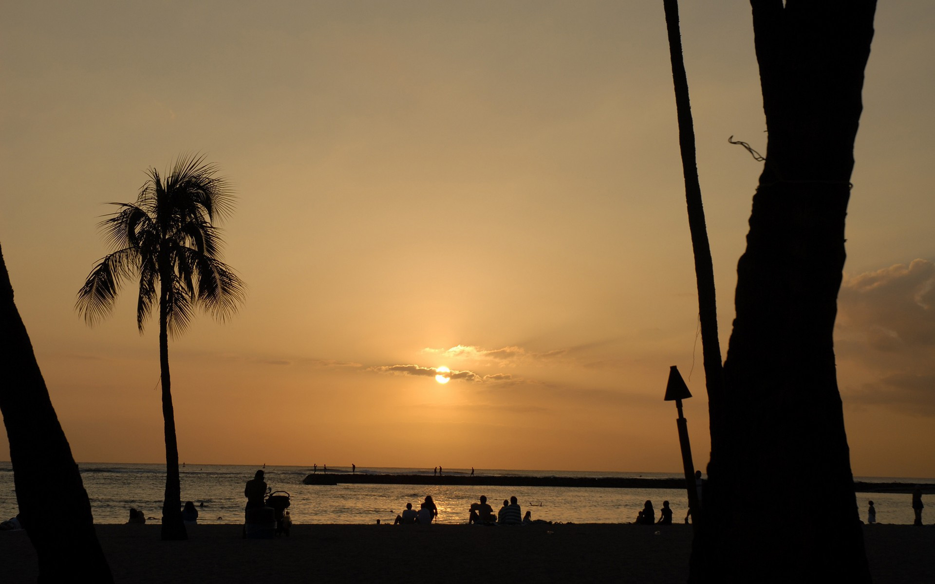 Description: A sunset view of a beach with palm trees and people sitting on the beach and walking on the sand.