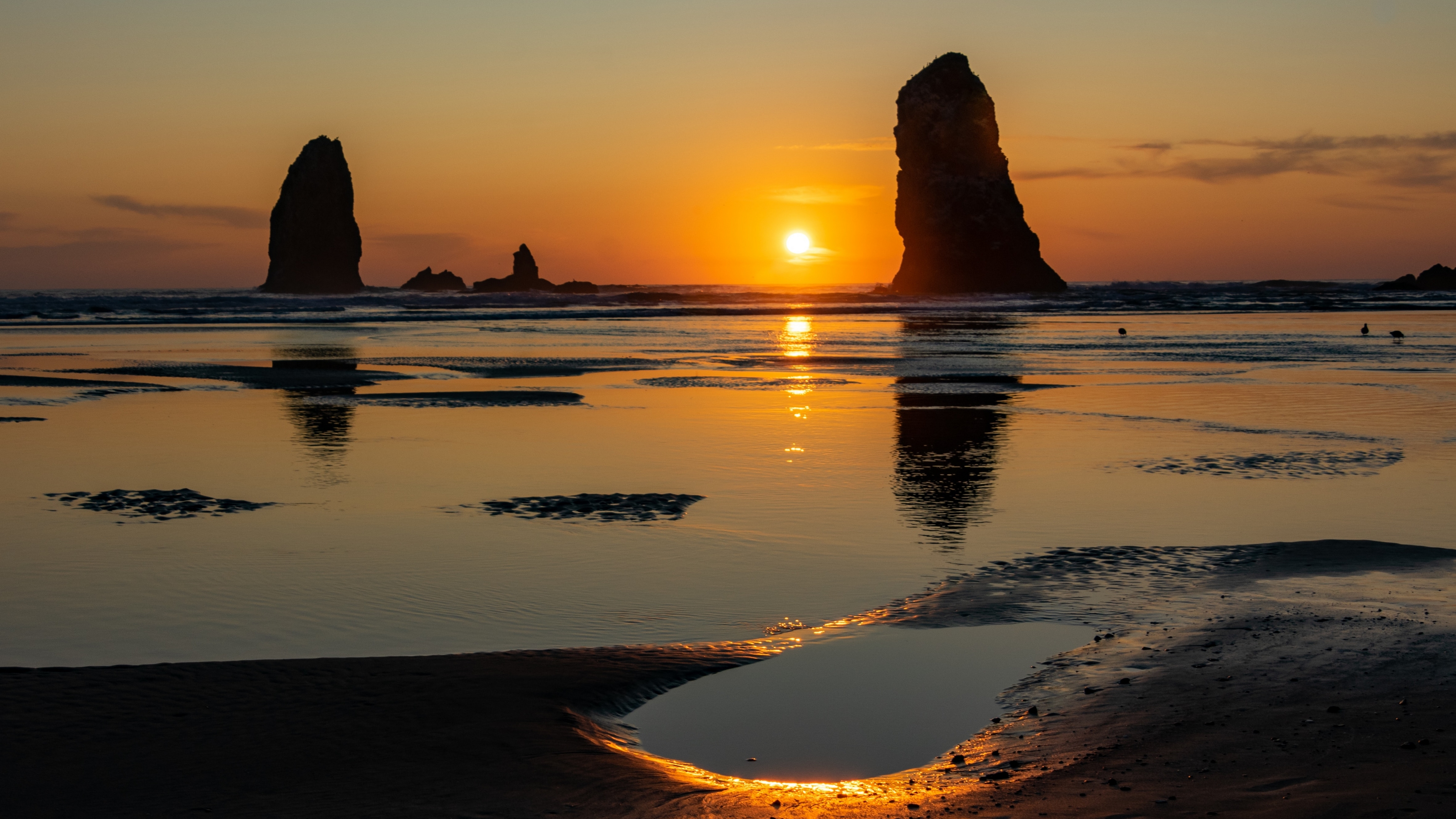 Description: A sunset over a beach with a rock formation in the background and a puddle of water in the sand.