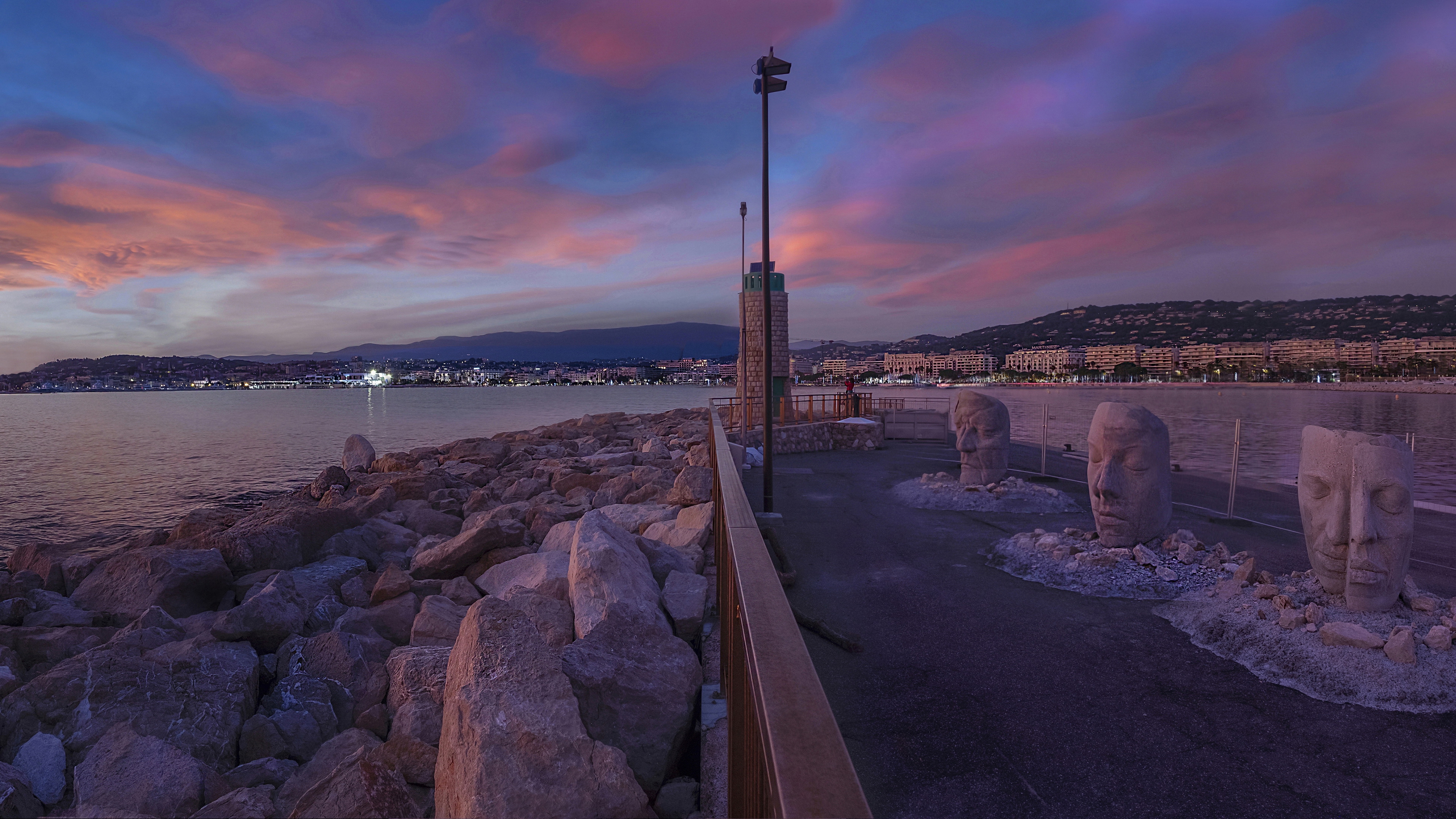Description: A sunset view of a beach with statues on the shore and a city in the distance with a pink sky.