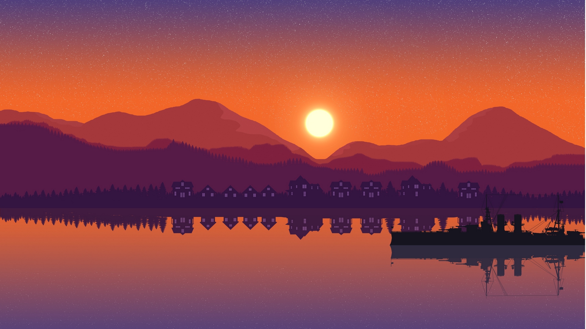 Description: A sunset scene with a boat in the water and mountains in the background with a red sun in the sky.