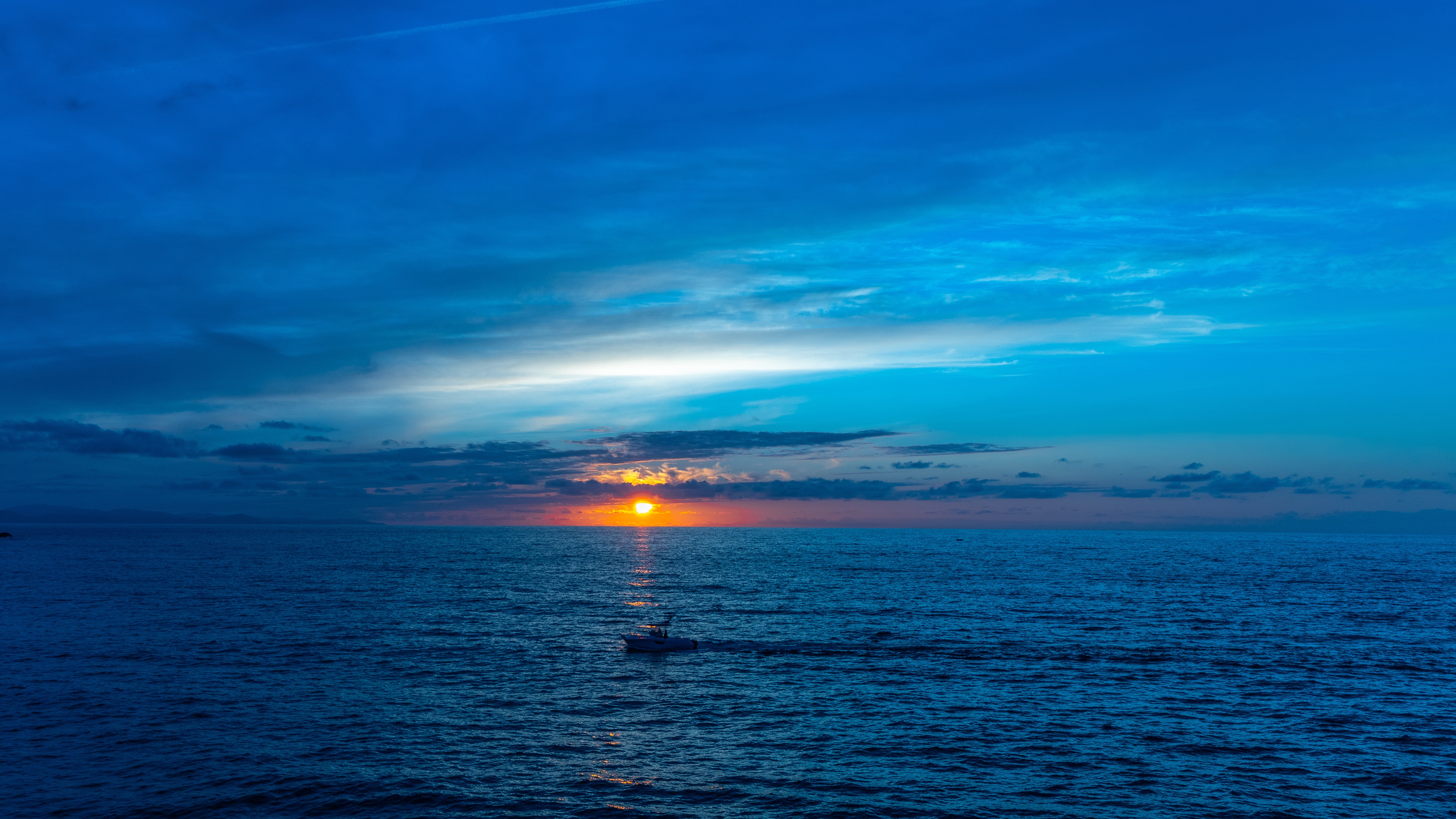 Description: A boat is out on the water at sunset time with the sun setting in the distance behind the clouds.