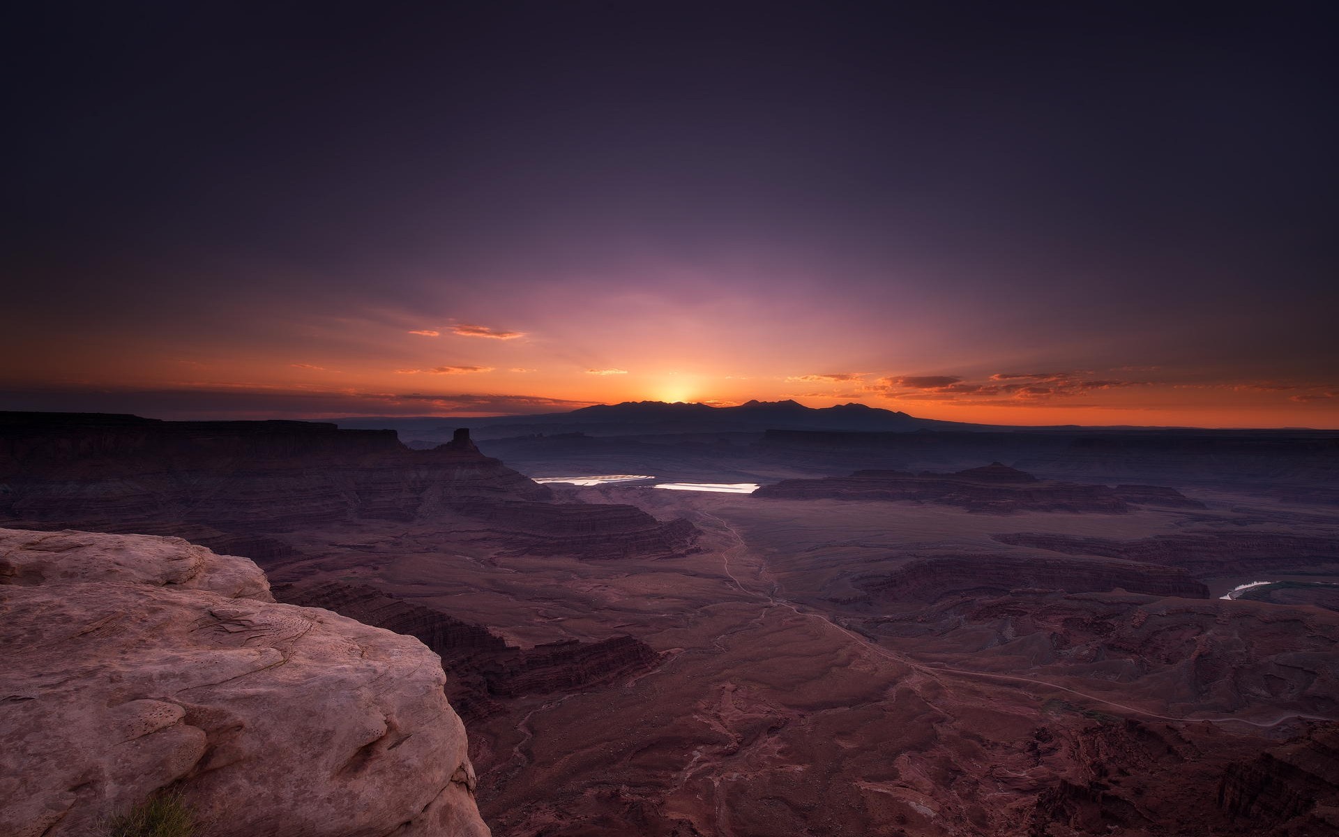 Description: A sunset over a canyon with a lake in the middle of it and mountains in the background with a dark sky.