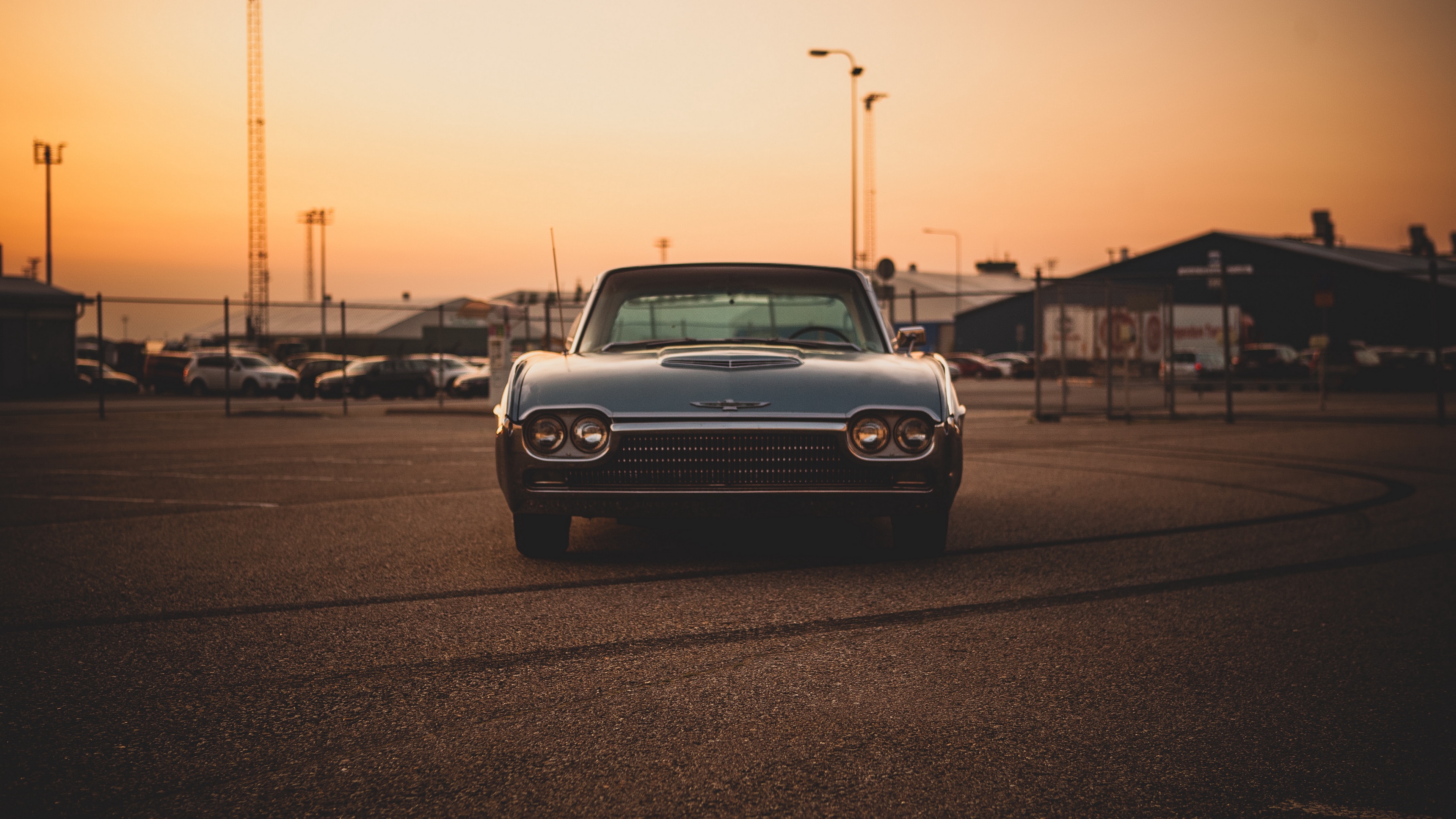 Description: A car parked in a parking lot at sunset or dawn with the sun setting in the background and a few cars parked in the lot.