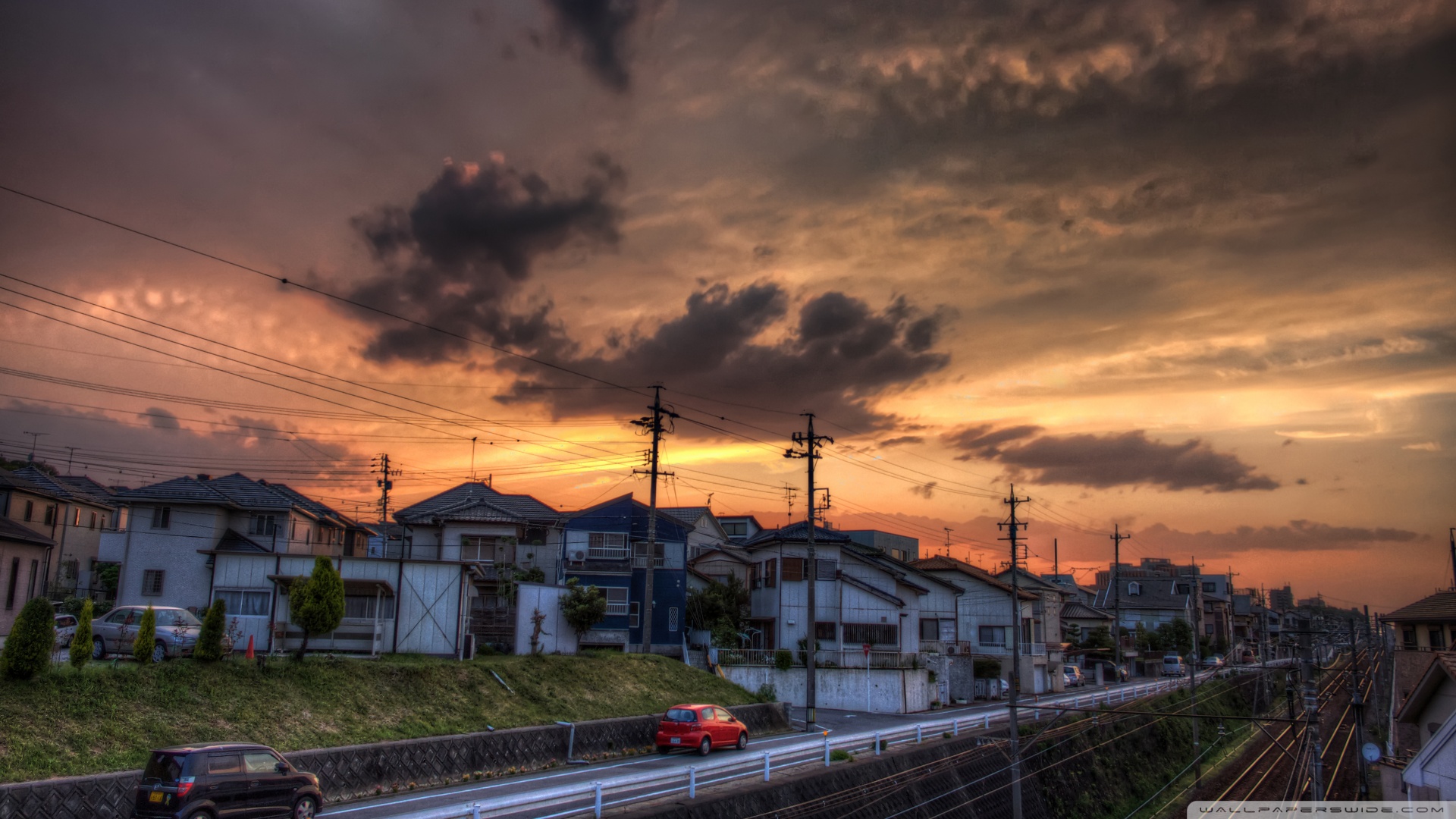 Description: A sunset view of a city with a red car driving down the road and a few buildings in the background.