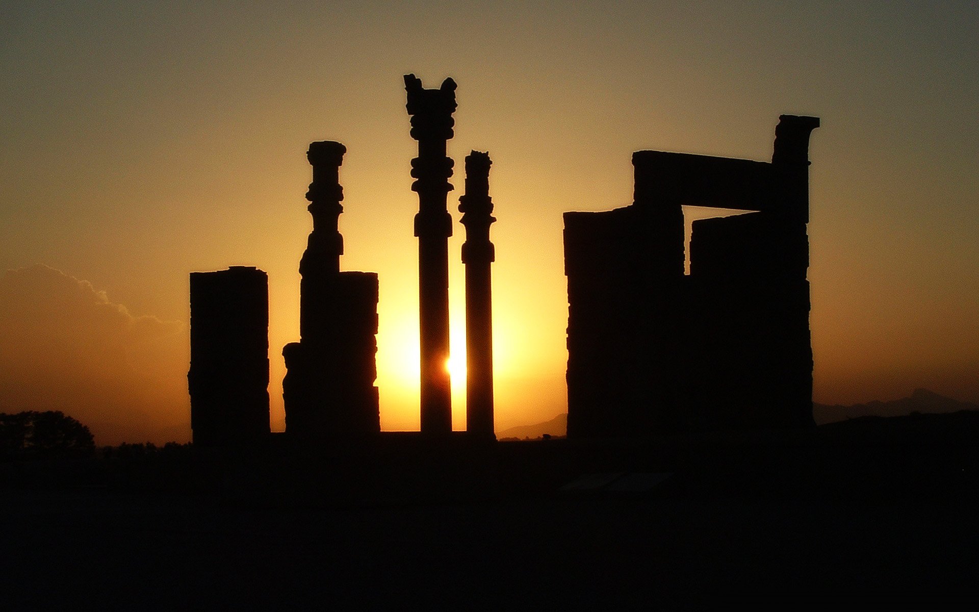 Description: A sunset behind a silhouette of a city with tall buildings and a clock tower in the foreground and a few buildings in the background.