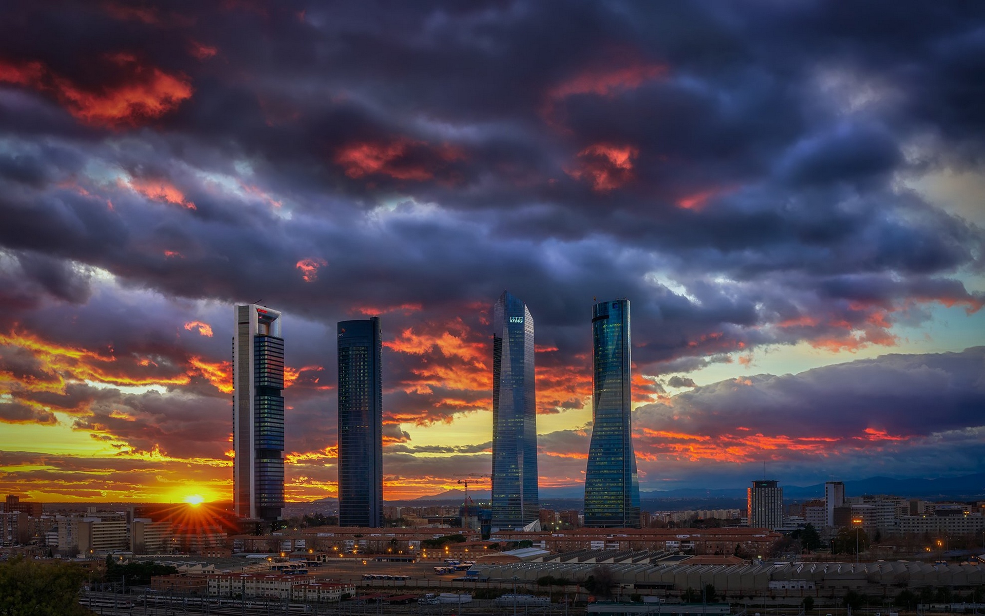 Description: A sunset view of a city with tall buildings in the background and a cloudy sky with a few clouds.