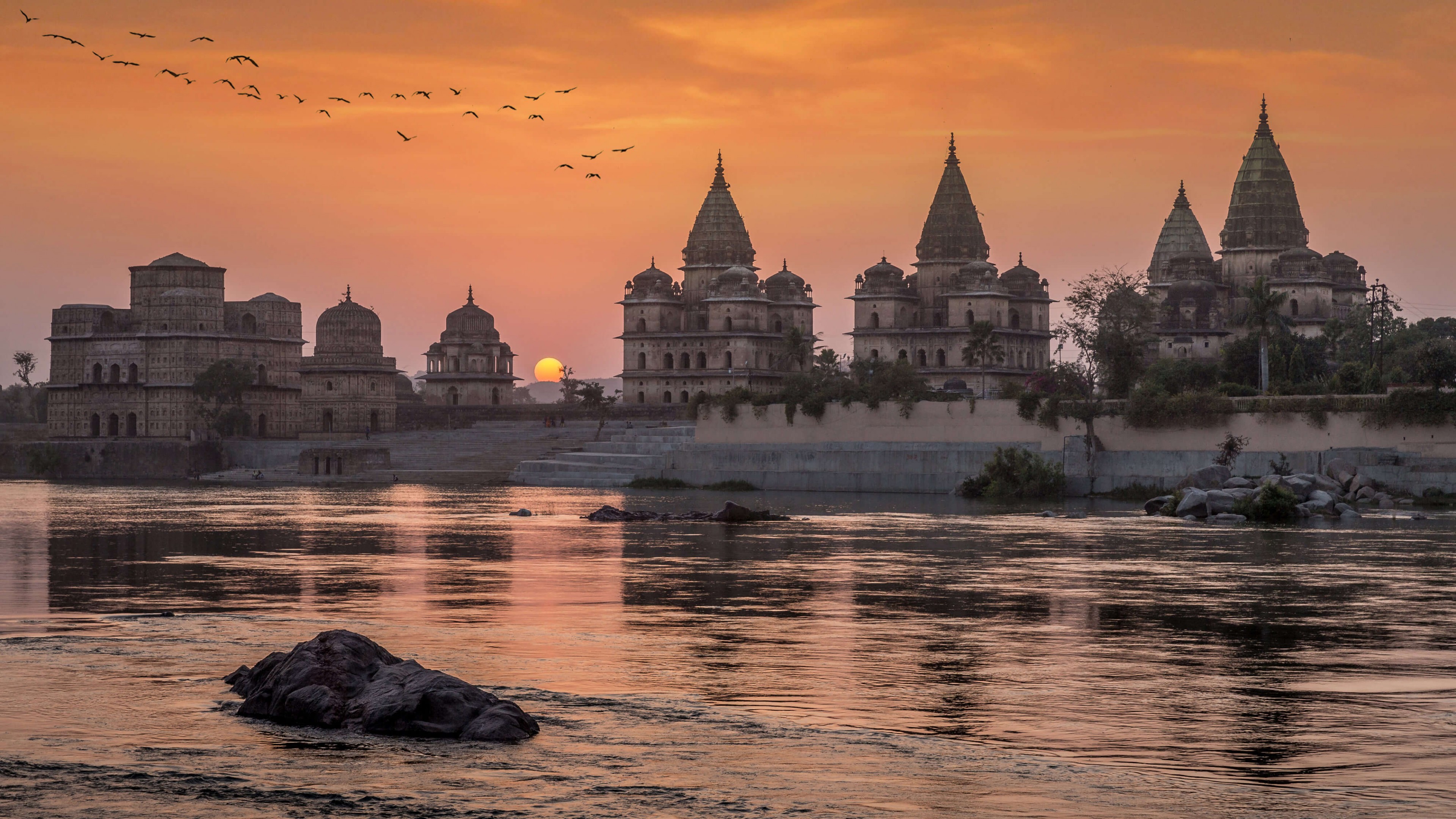 Description: A sunset view of a city with a body of water and a large building with spires on it.