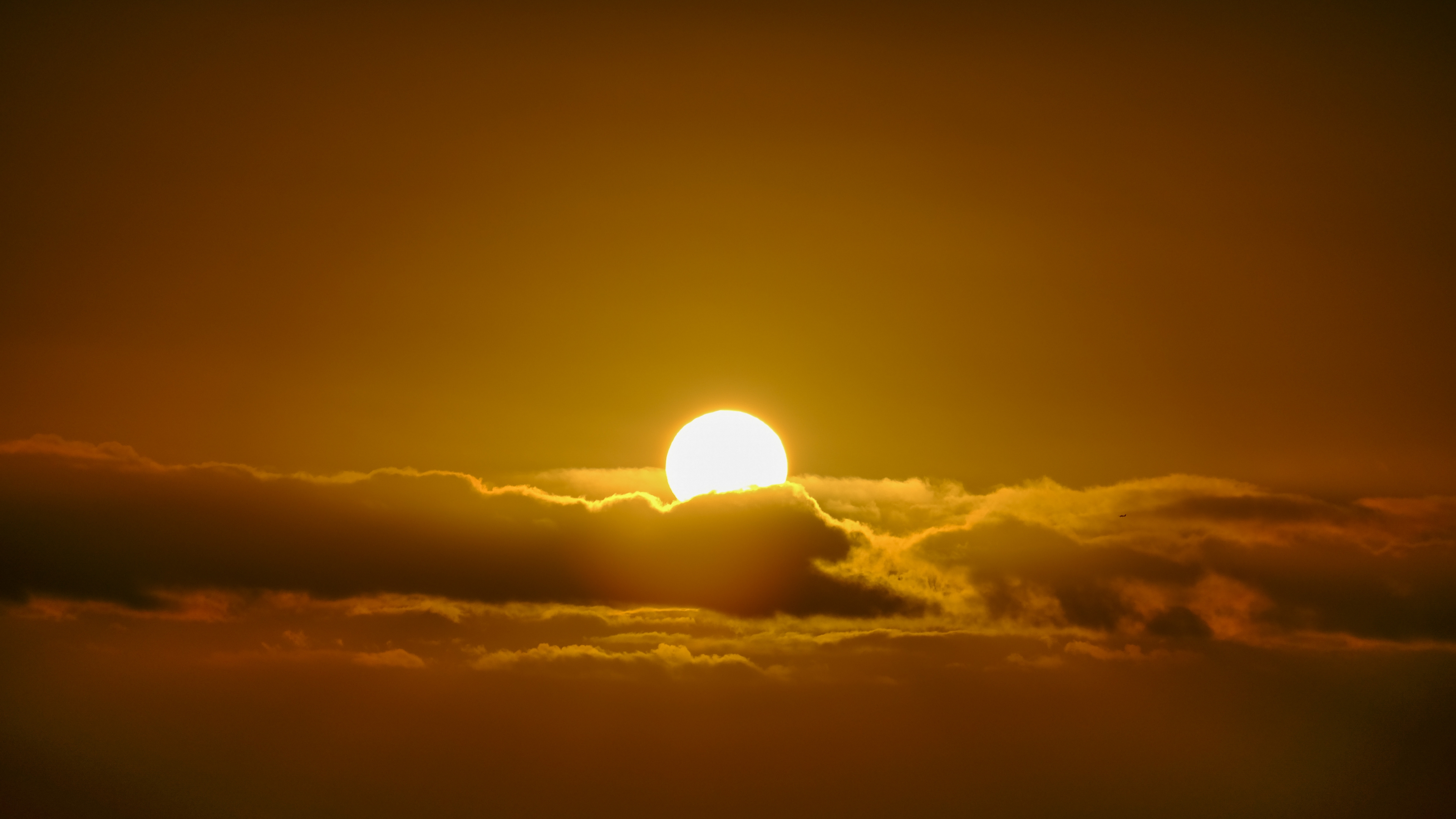 Description: A sun setting in the sky with clouds in the foreground and a plane in the foreground with a plane in the foreground.