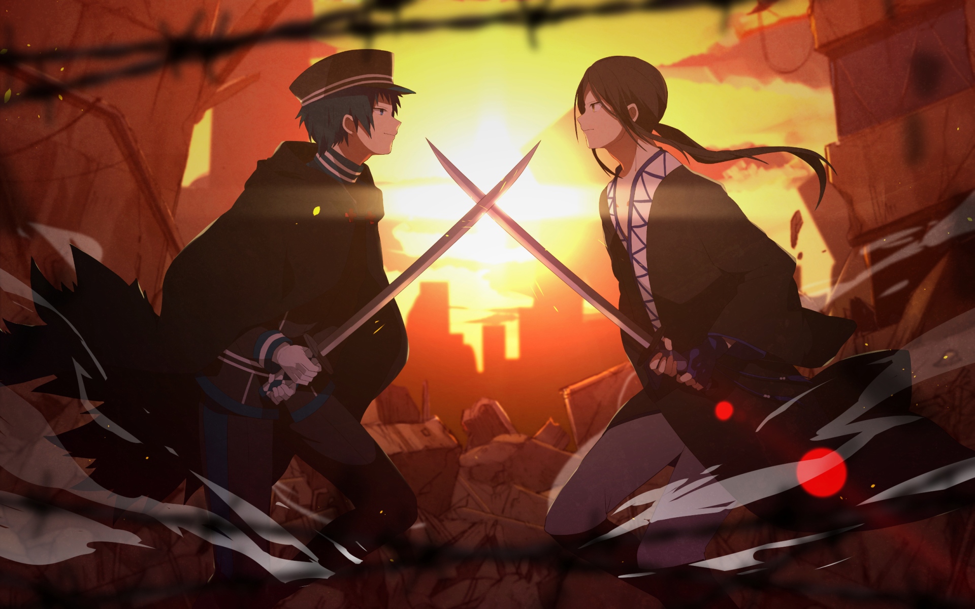 Description: A couple of people standing next to each other in front of a sunset with two swords in their hands.