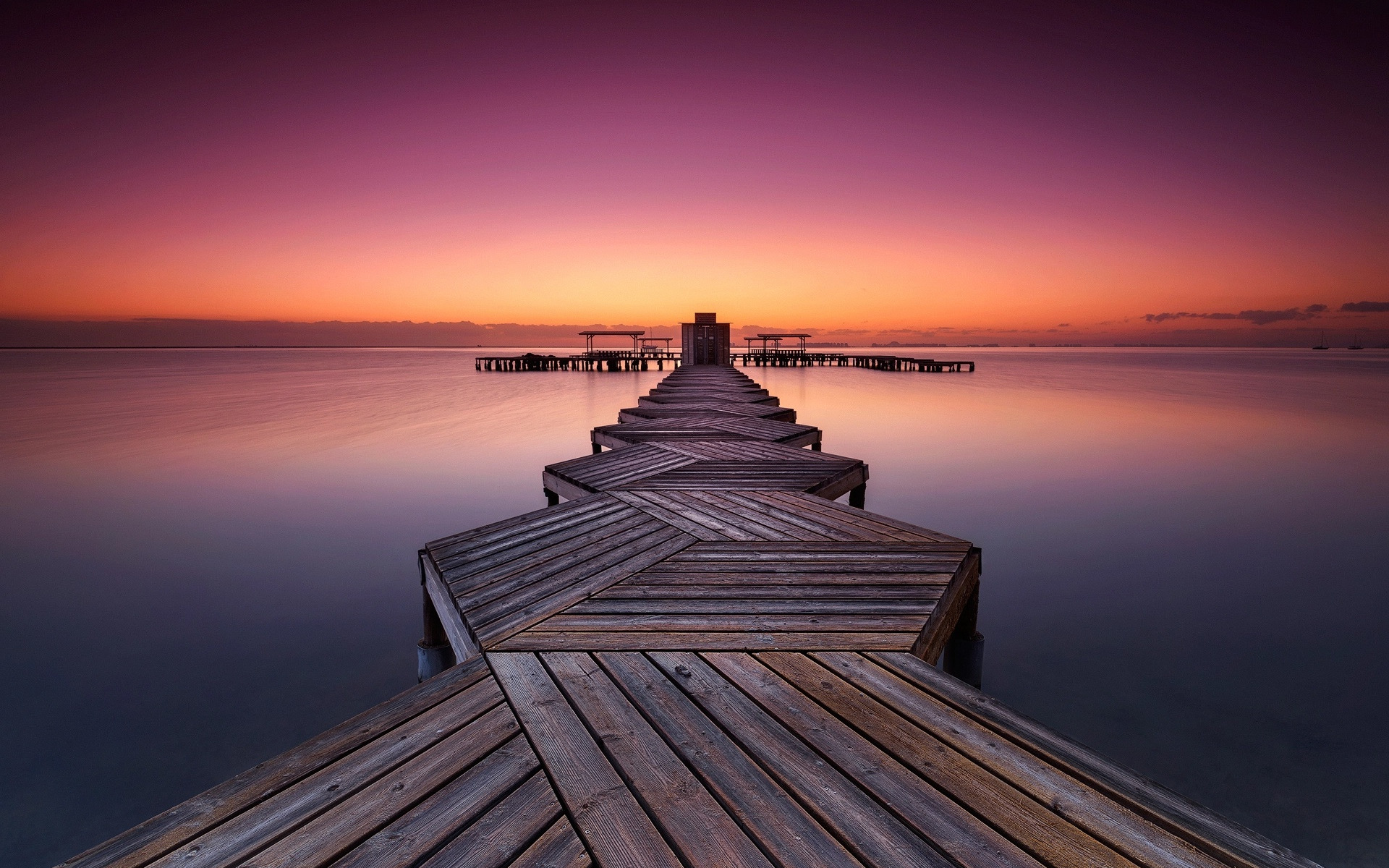 Description: A dock that is sitting in the water at sunset with a pier in the background and a pier in the foreground.