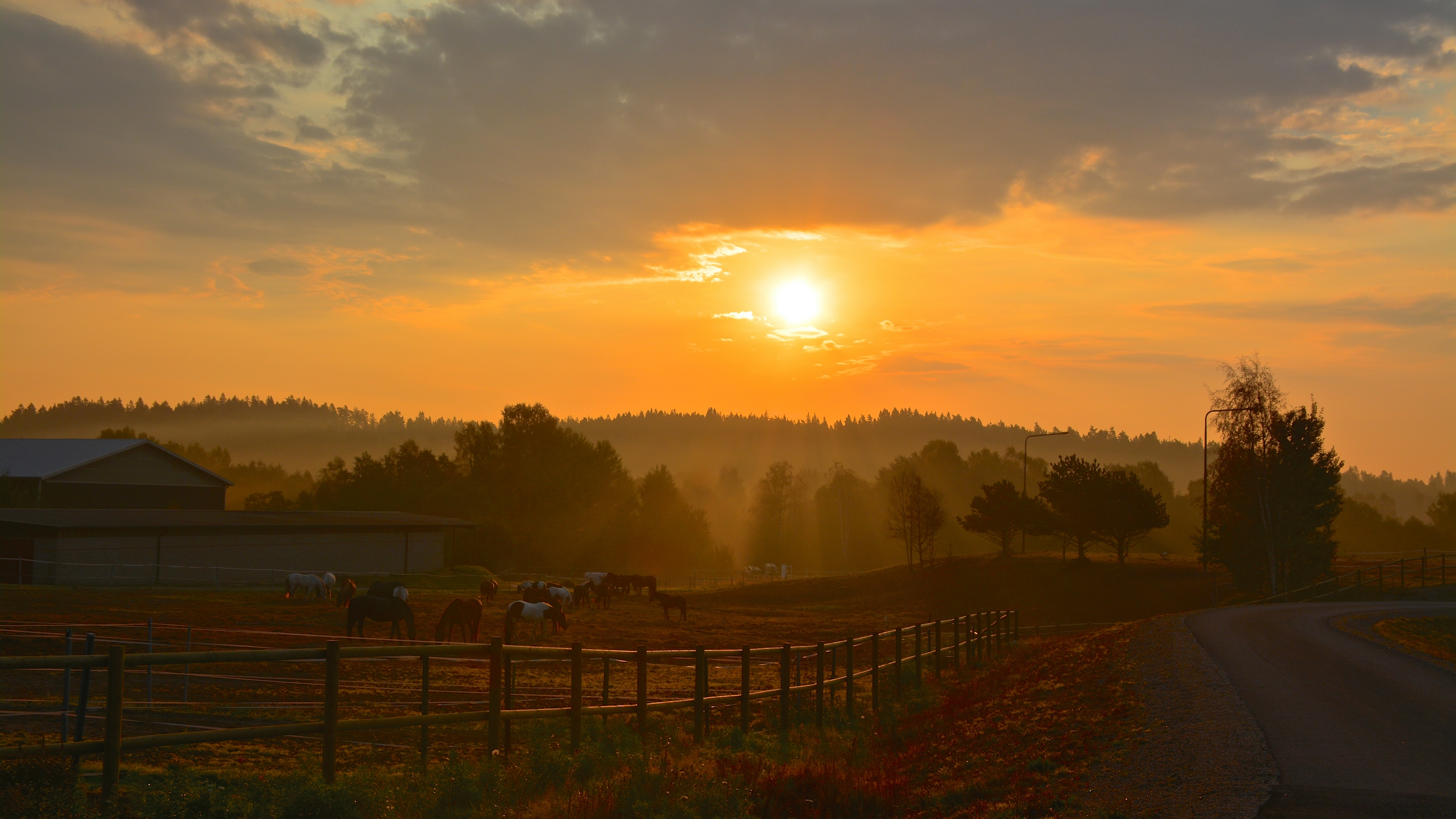 Description: A sunset over a farm with horses grazing in the field and a barn in the distance with a fence.