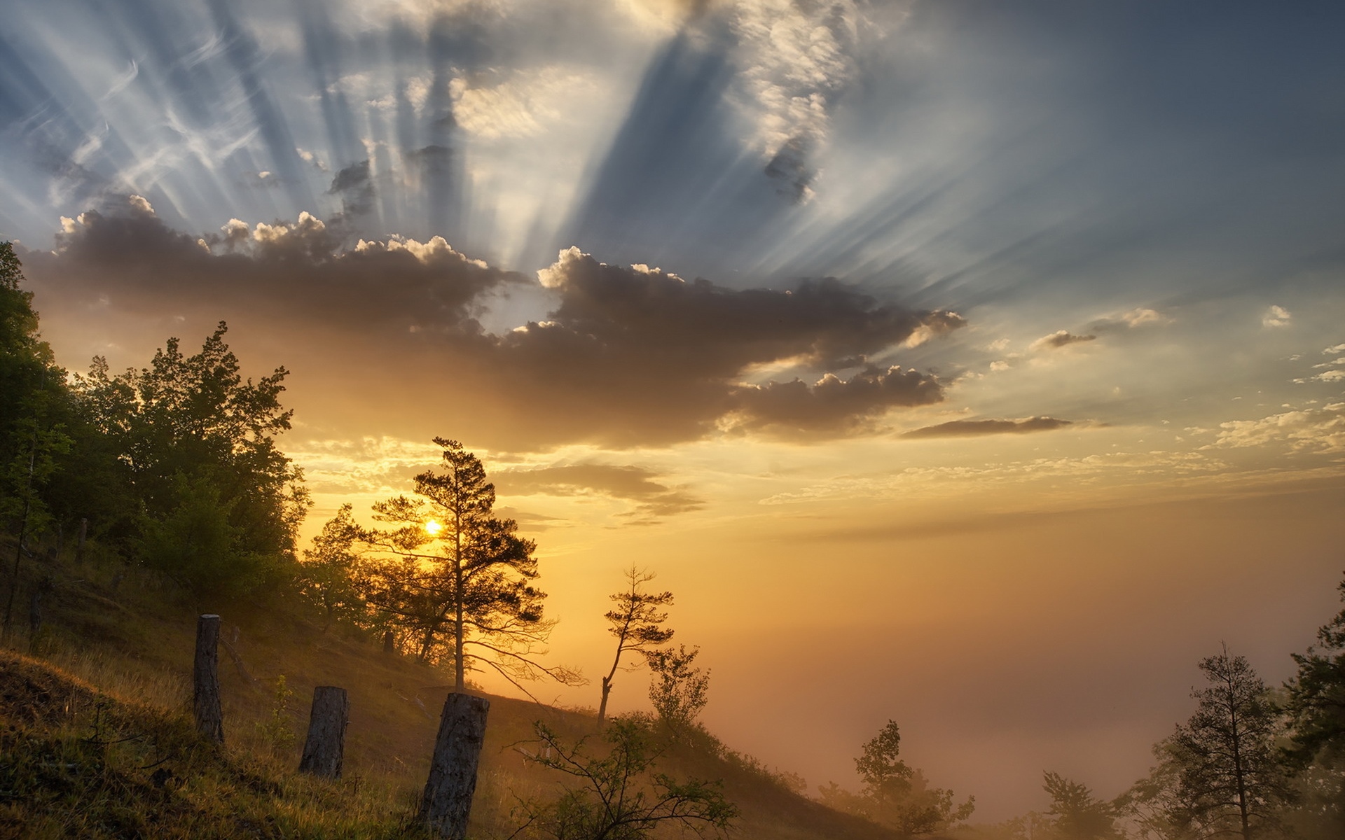Description: A sunset with a fence and trees on a hill side with a sky filled with clouds and sun rays.