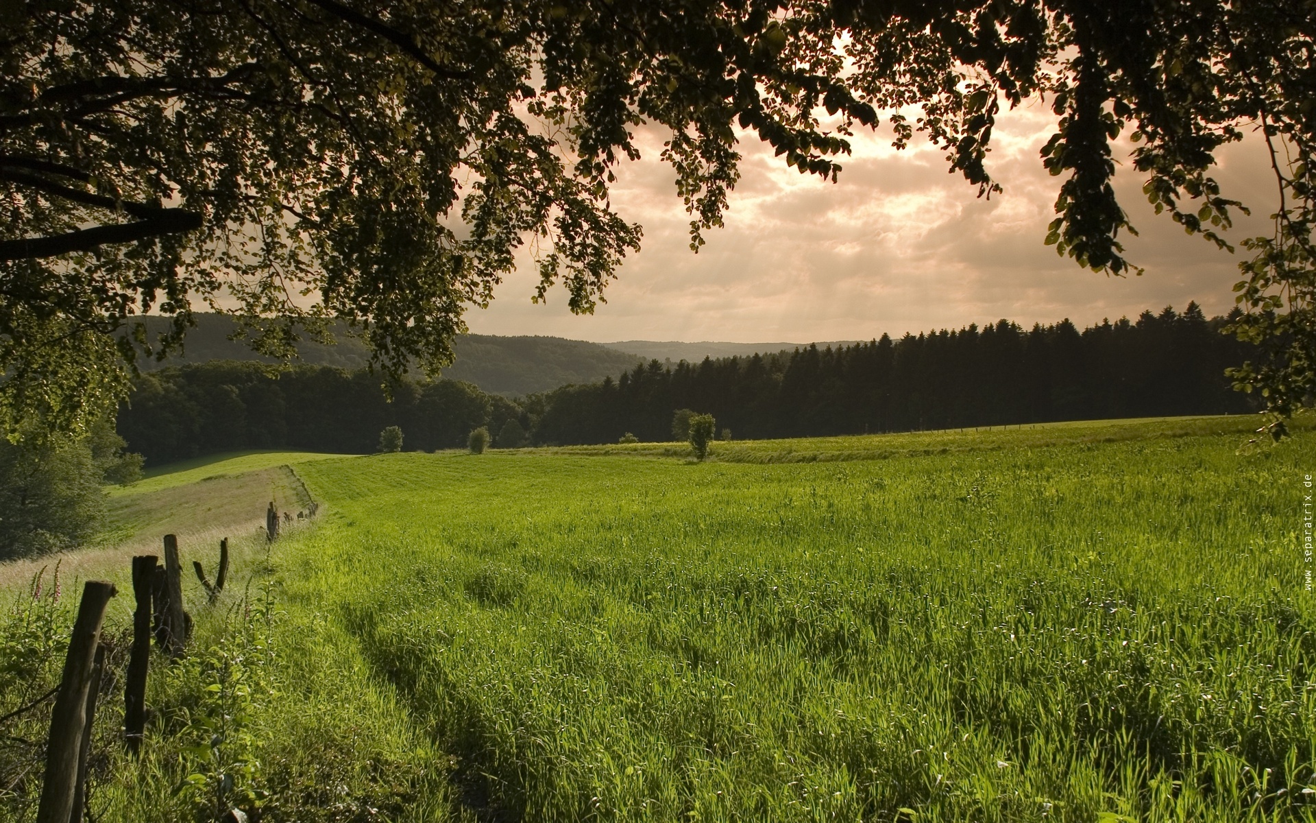 Description: A field with a fence and trees in the background and a sunset in the distance with clouds in the sky.