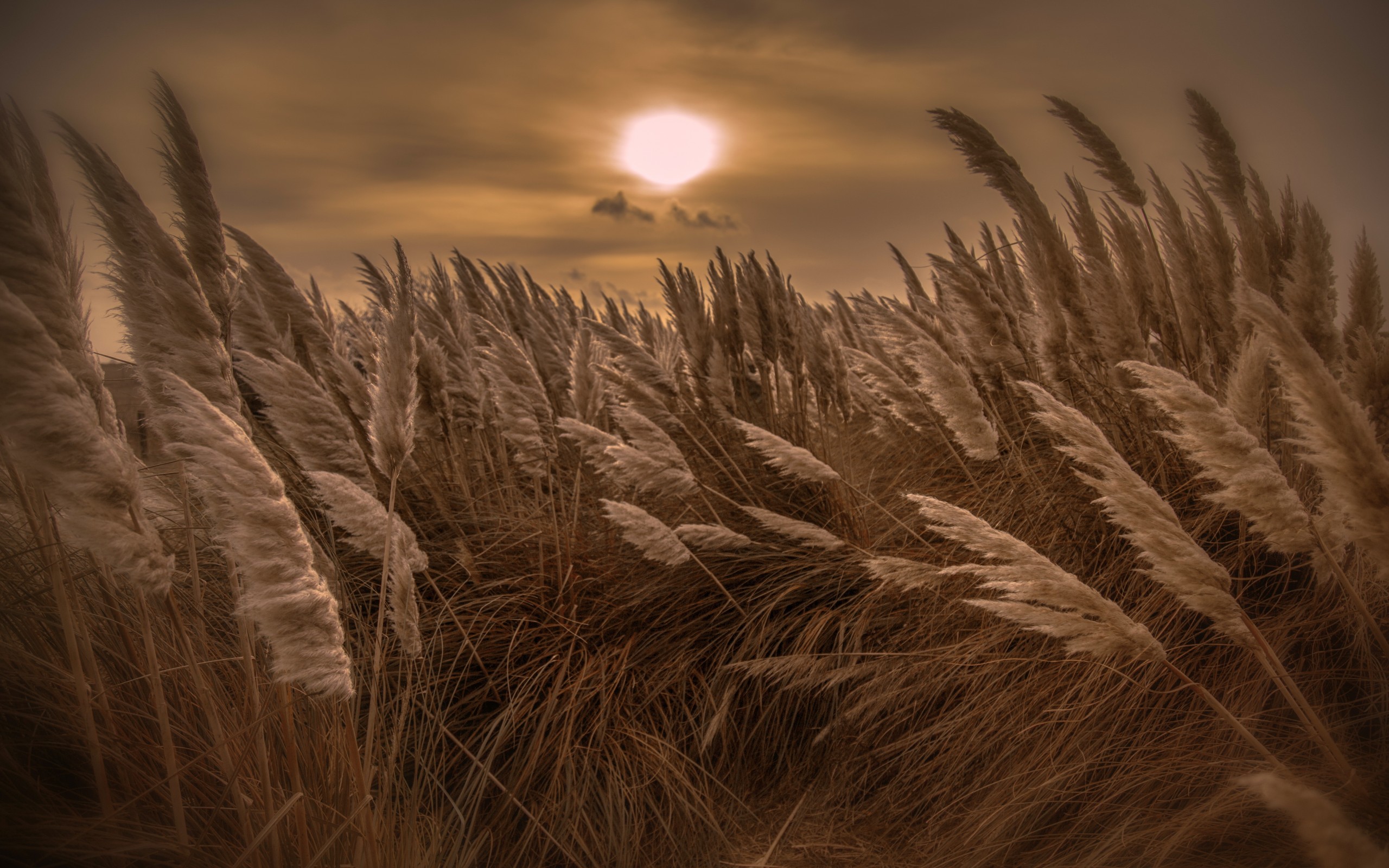 Description: A field of tall grass with the sun in the background and clouds in the sky above it.