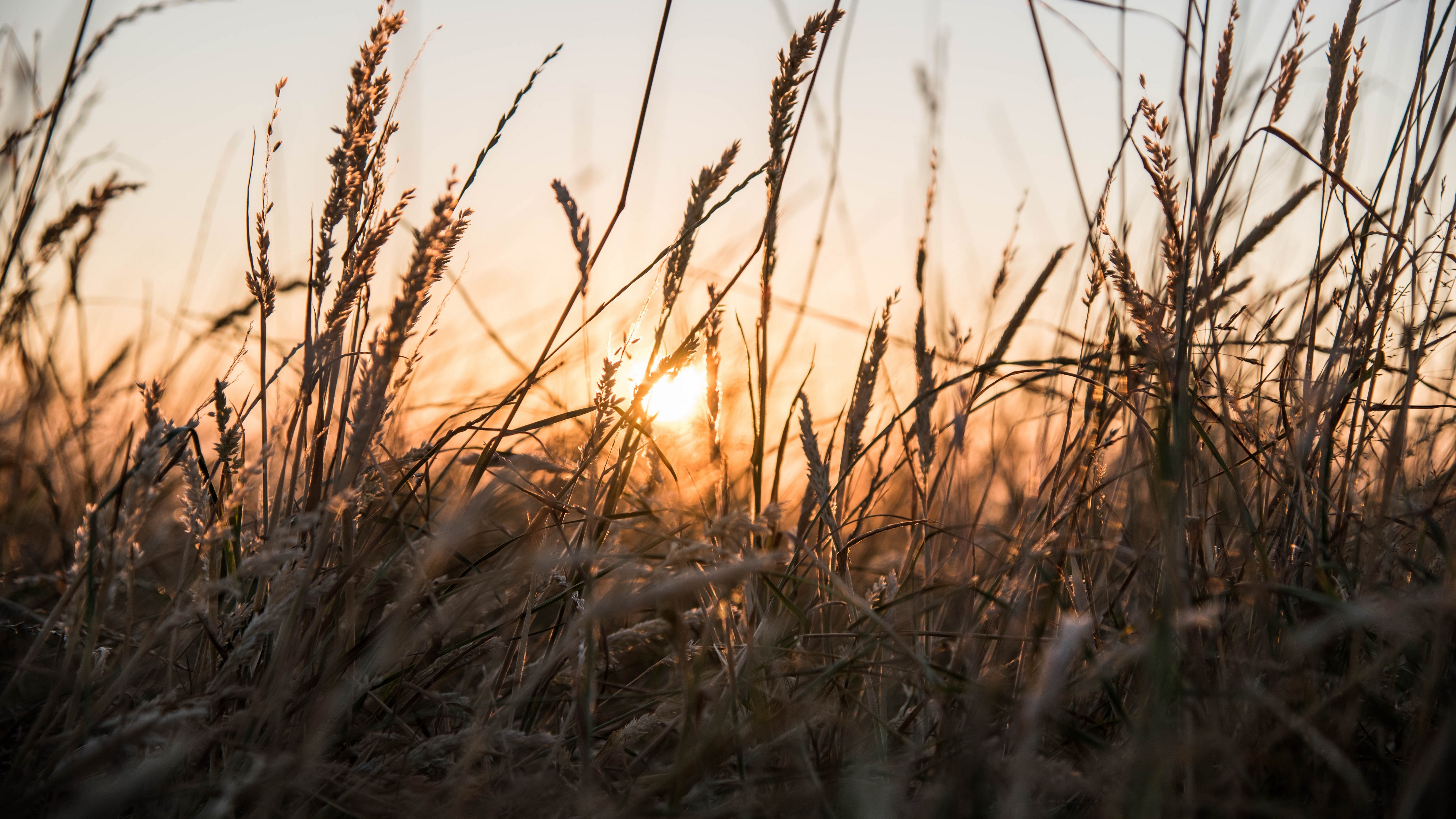 Description: A field of tall grass with the sun setting in the background and a few clouds in the sky above.