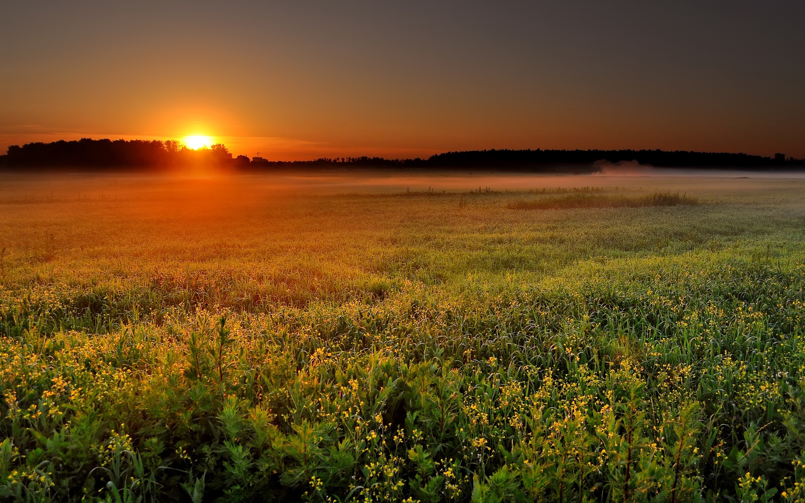 Description: A field with a sun setting in the distance and fog in the air above it and a field of flowers in the foreground.