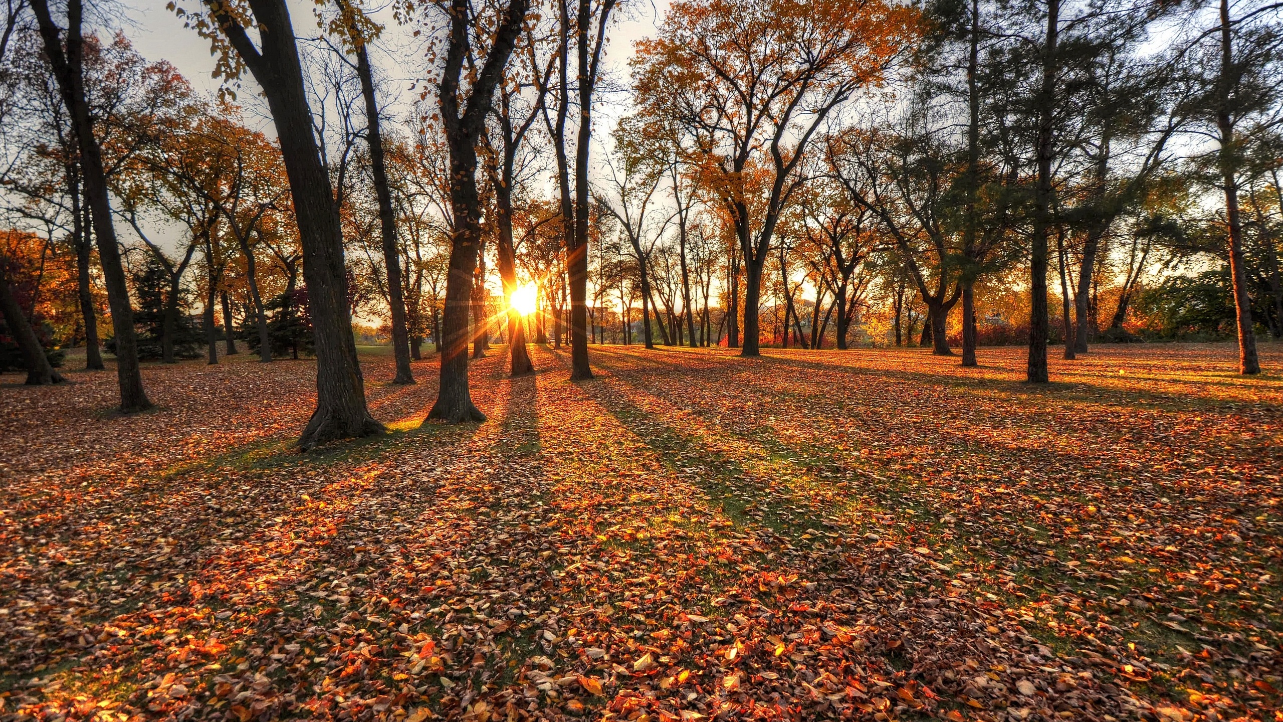 Description: A sun setting in the distance through a forest filled with leaves and trees with the sun shining through the trees.