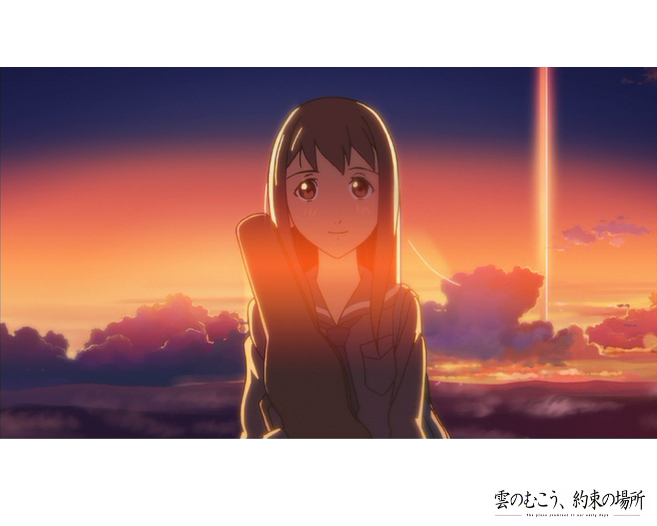 Description: A girl standing in front of a sunset with clouds and a sky background with a bright light shining on her.