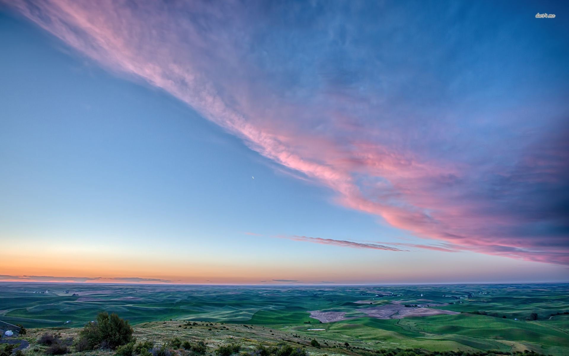Description: A beautiful sunset over a green field with a pink cloud in the sky above it and a blue sky above.
